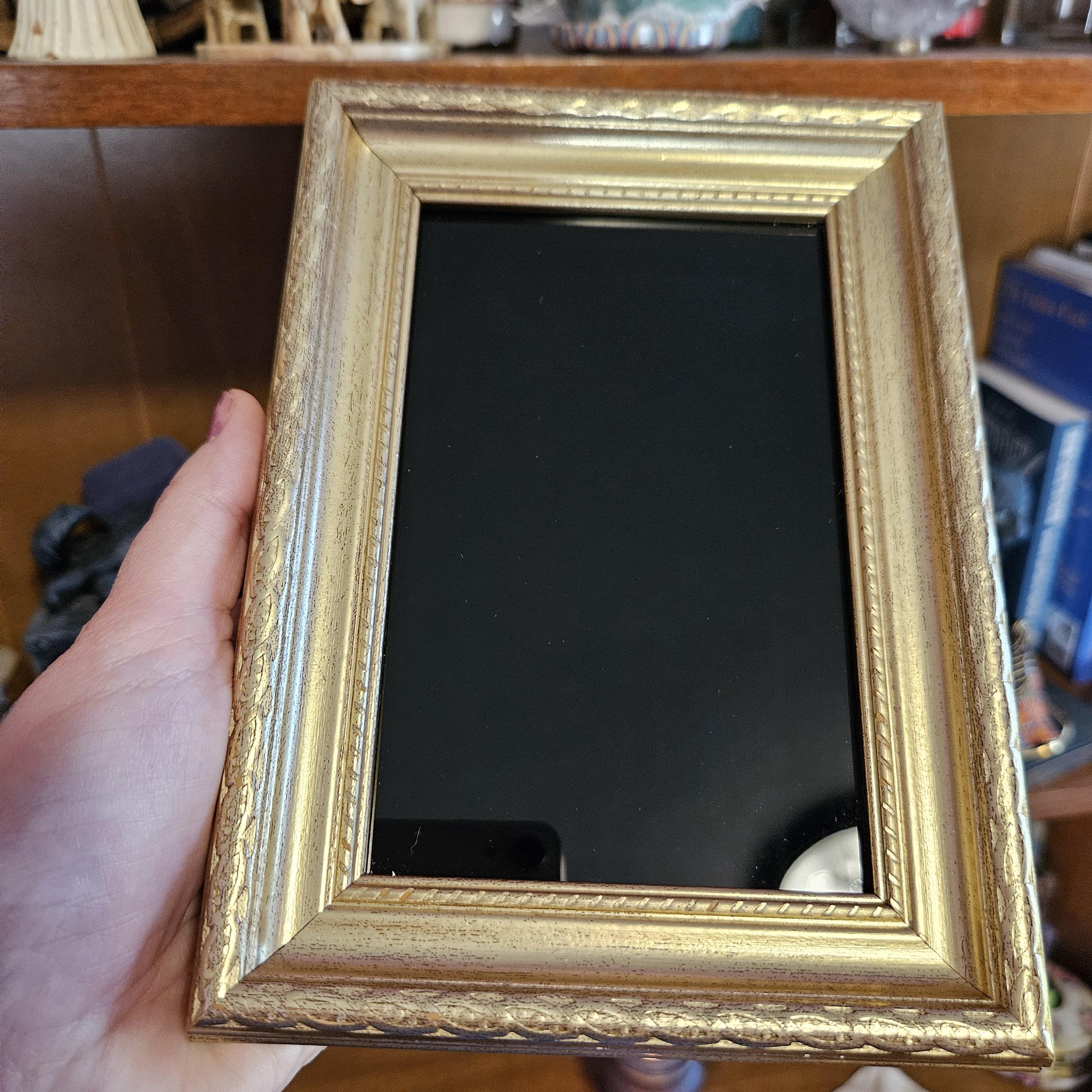 This black mirror is crafted from a lovely gold washed frame. It has a perfectly black reflective glass to enhance focal aspects during sessions.