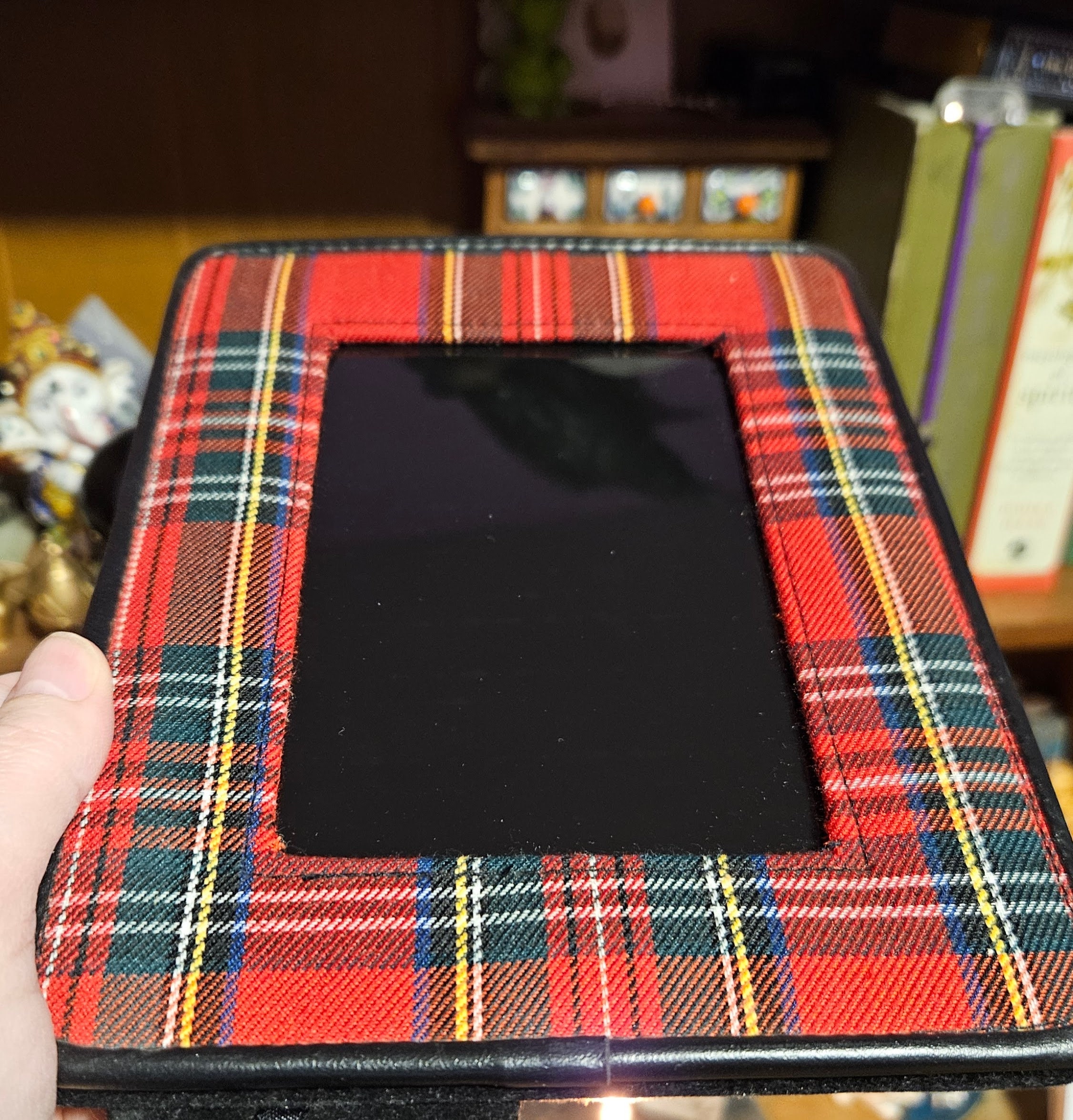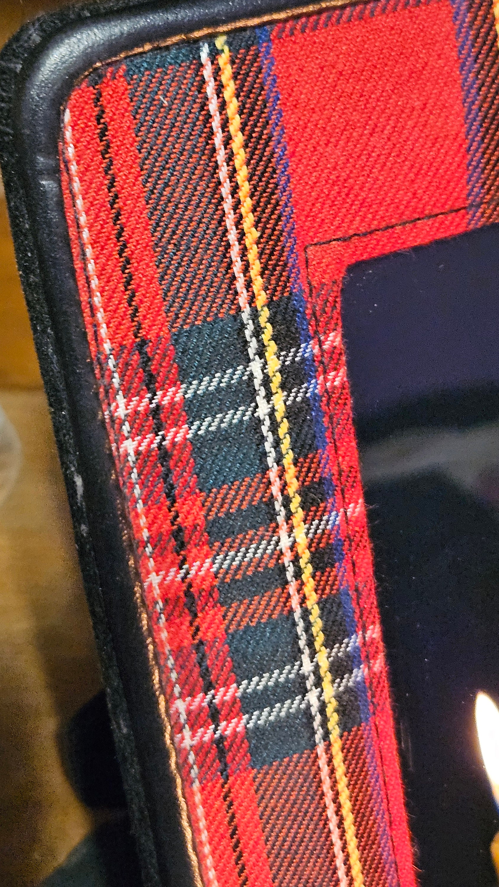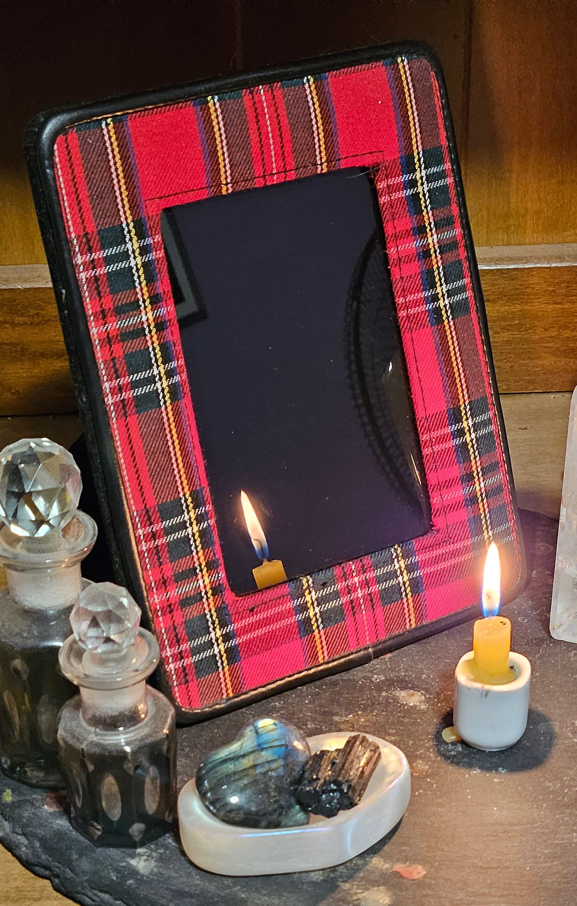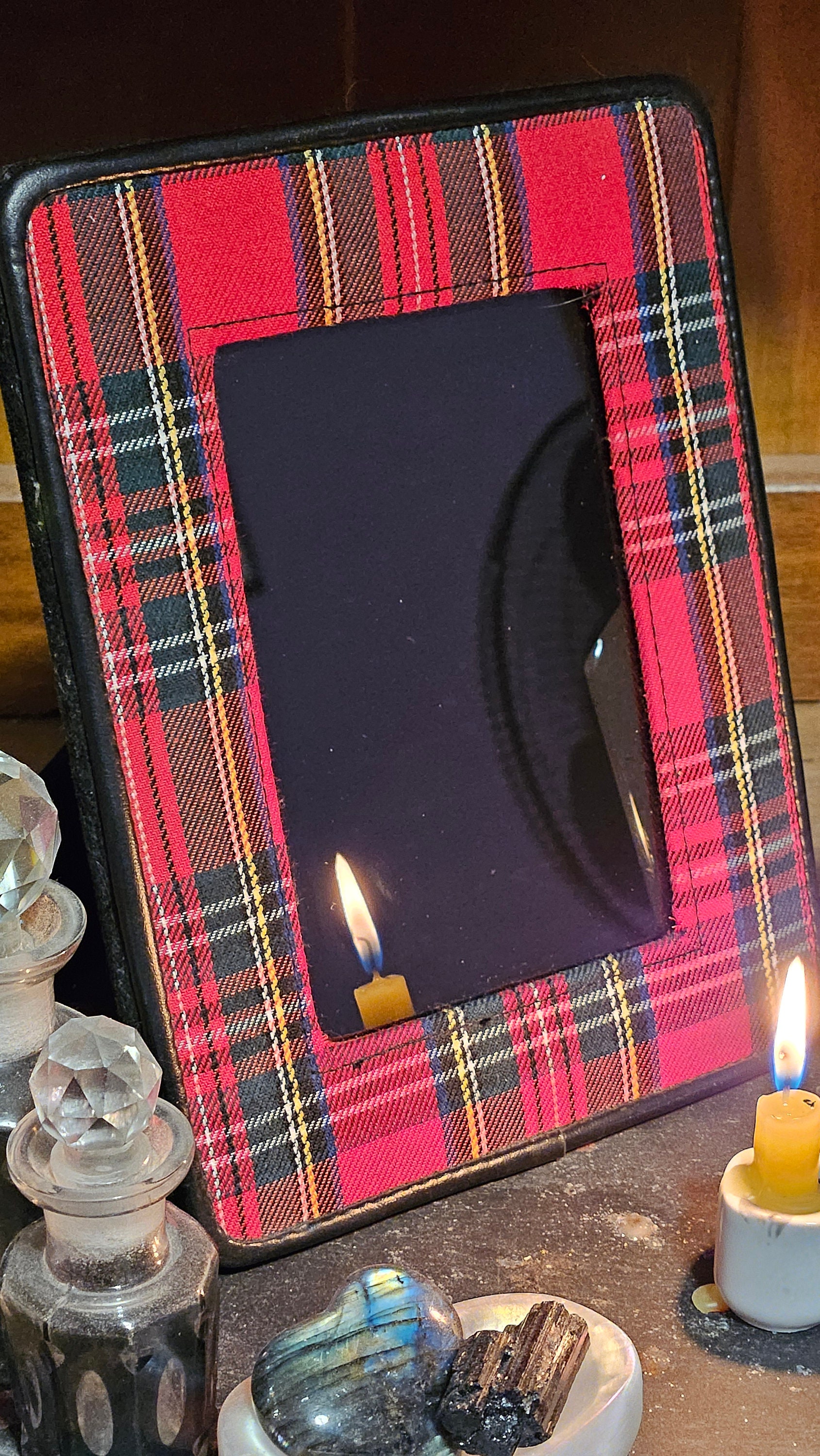 This black mirror is crafted from a lovely frame with a wonderful plaid material with leather (like) trim. It has a perfectly black reflective glass to enhance focal aspects during sessions.