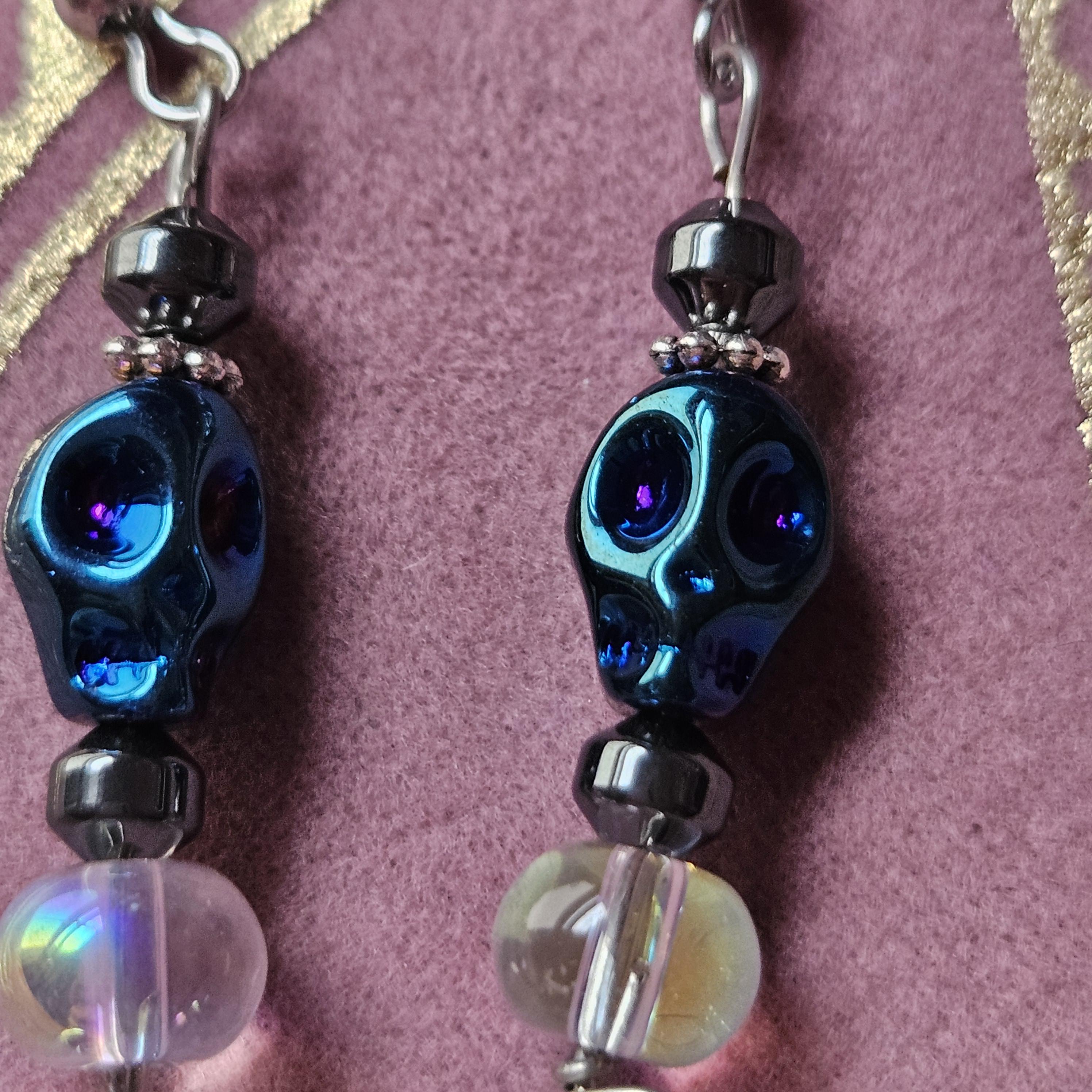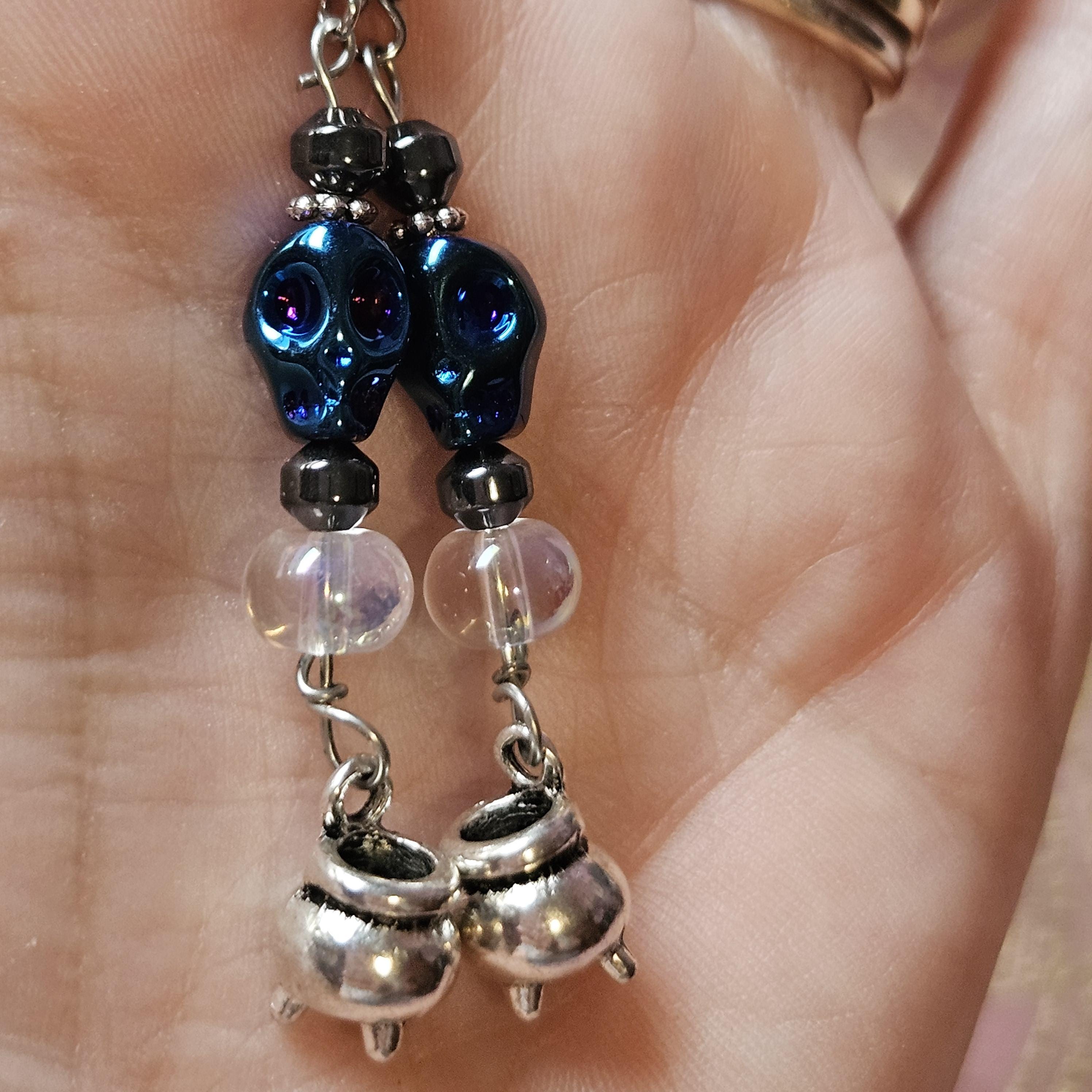 Add a dash of mystical charm to your day with these witchy skull and cauldron earrings! Handcrafted with intention and care, each earring features an iridescent blue skull bead, a glowing mermaid glass orb, and a silver-tone cauldron charm—all perfectly stacked to capture that darkly enchanting vibe.