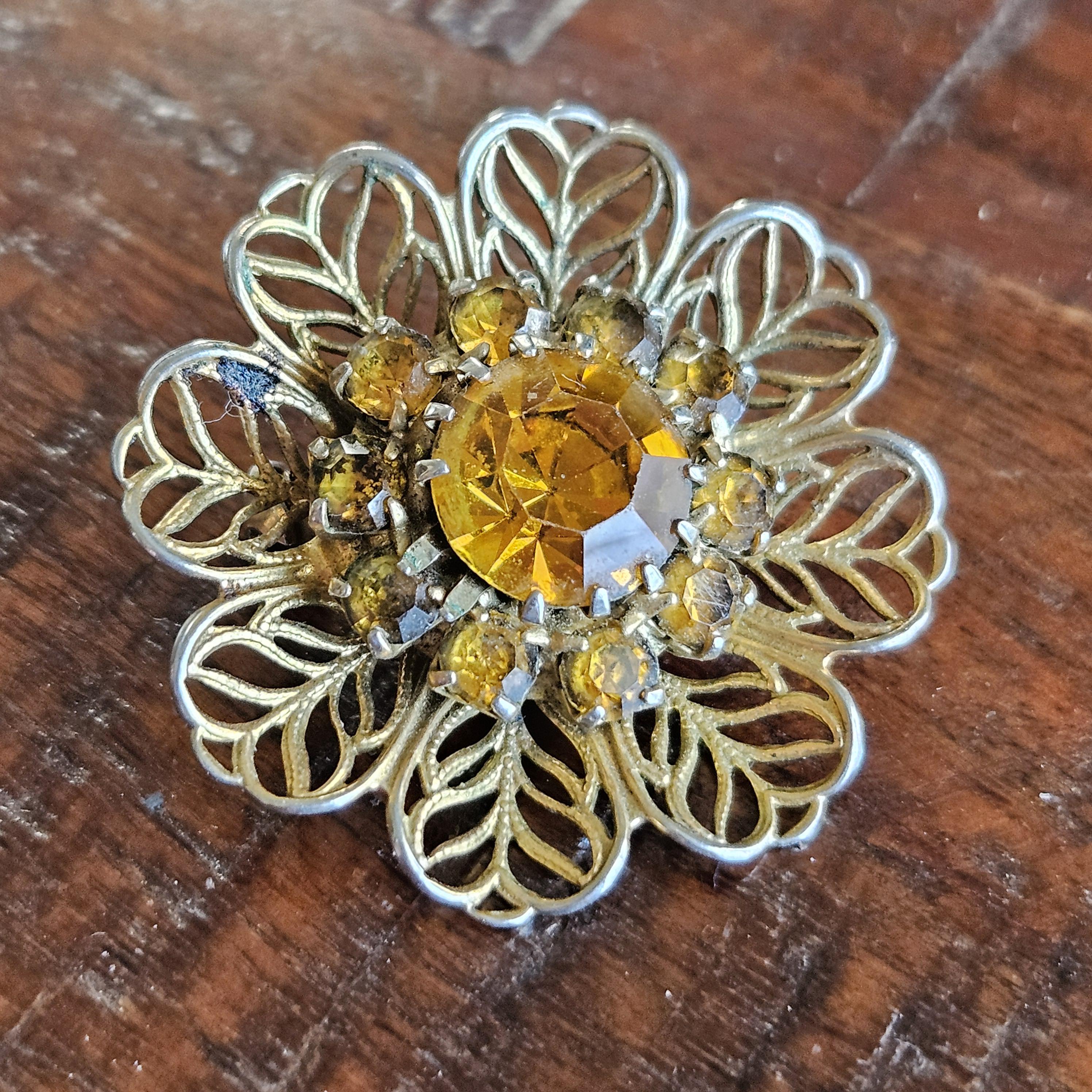 Timeless elegance meets quiet enchantment in this 1940s gold-tone floral brooch, adorned with rich amber-hued rhinestones that capture the warmth of abundance and personal radiance. Designed with a central focal stone surrounded by ten smaller gems, this vintage treasure embodies the balance of energy, resilience, and the steady accumulation of success in everyday life.