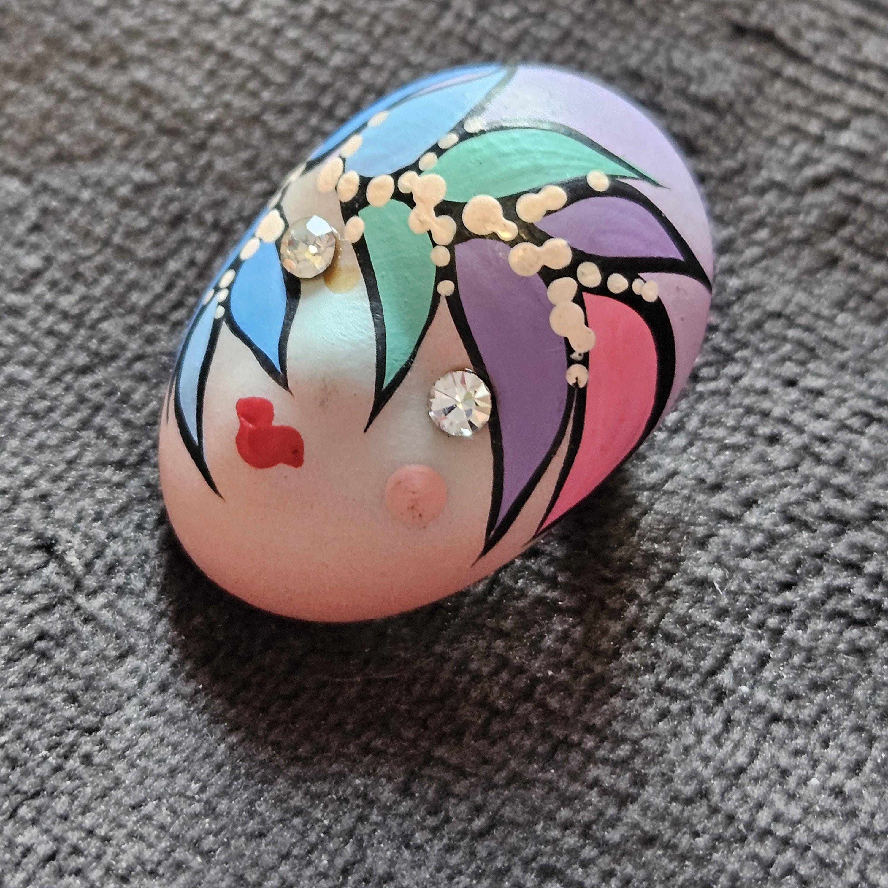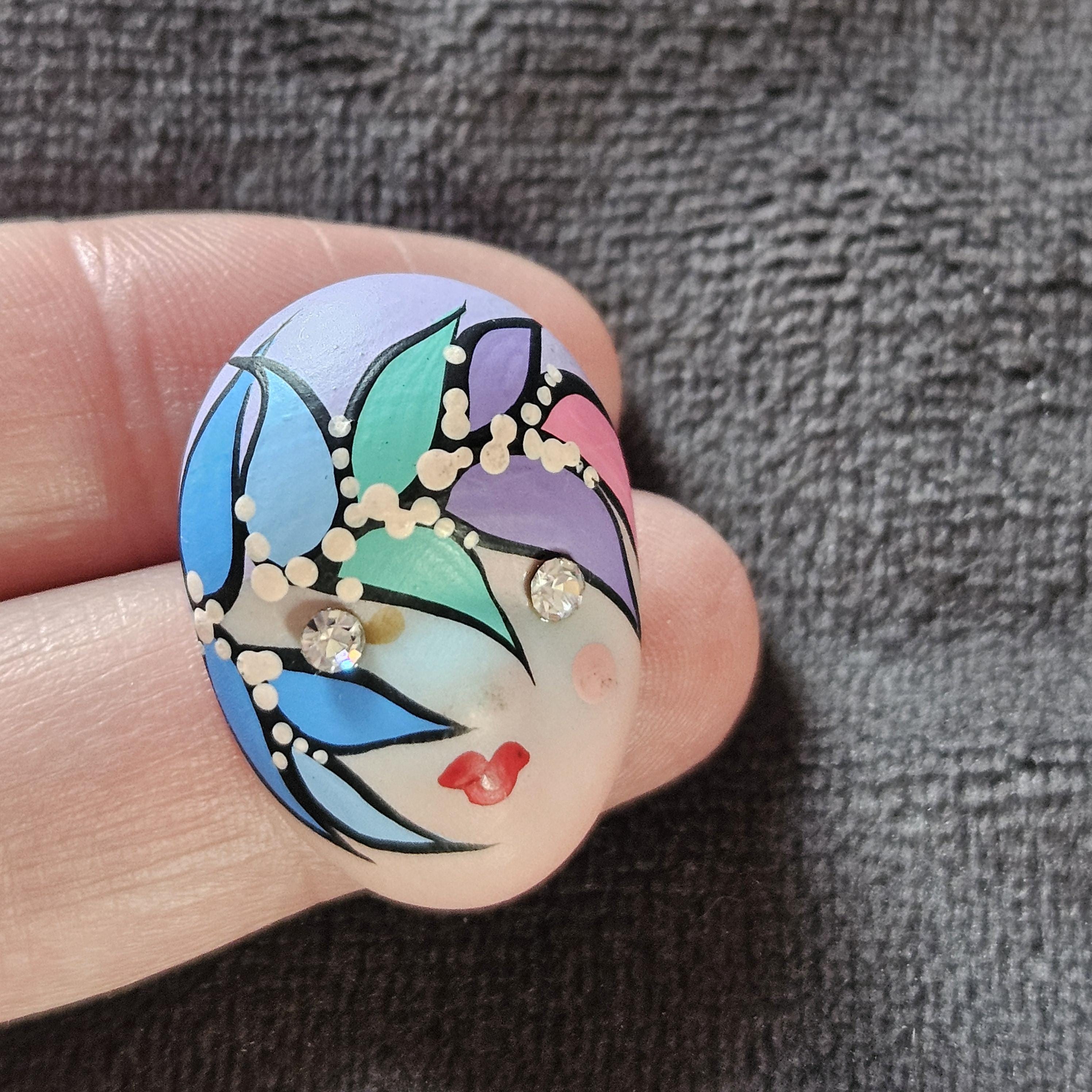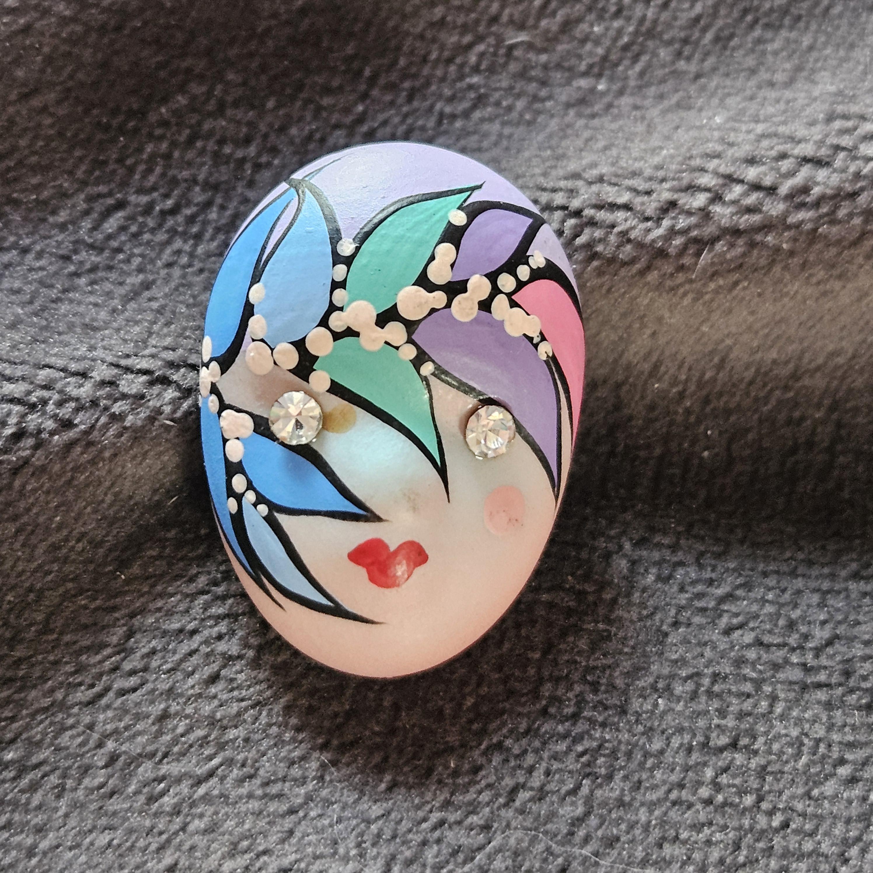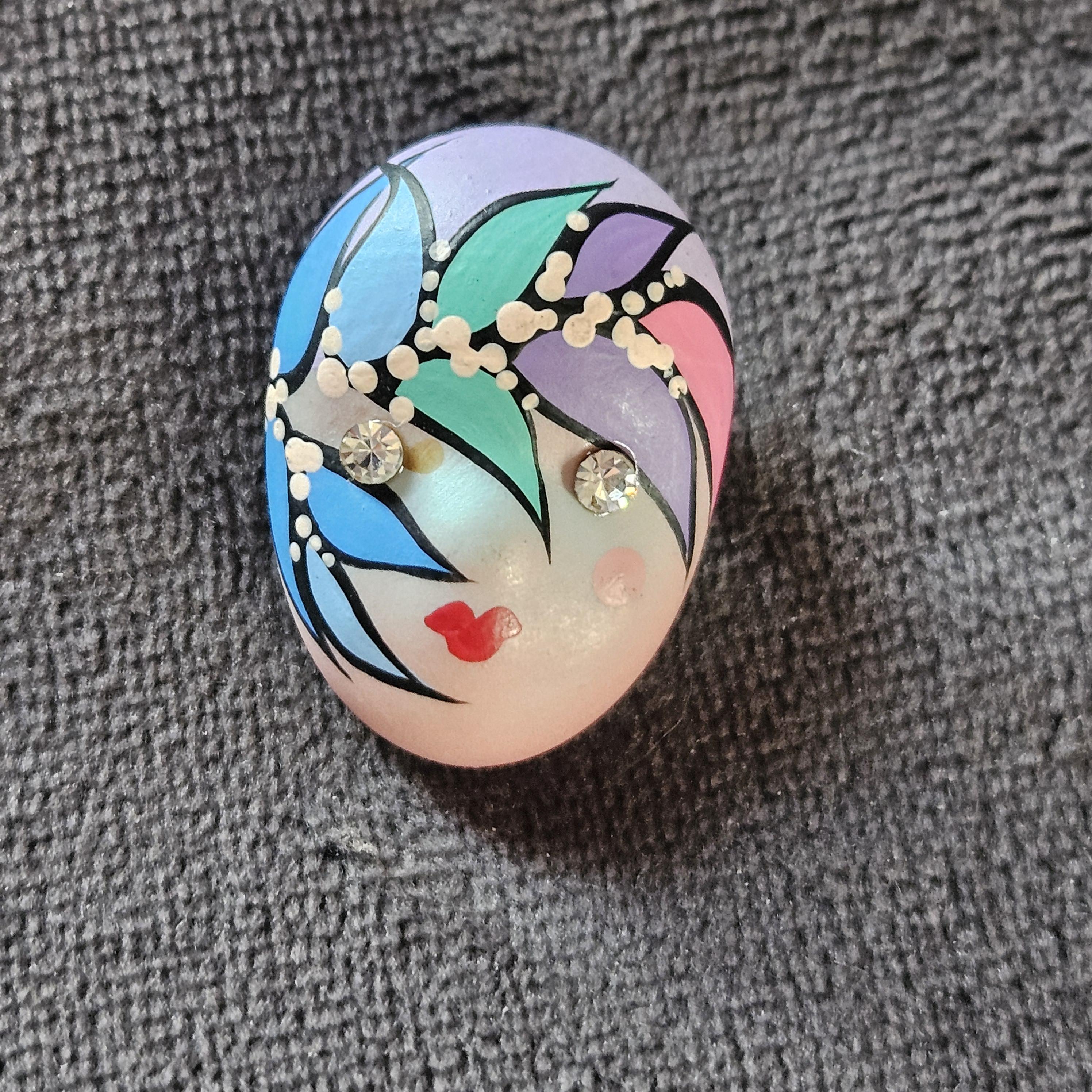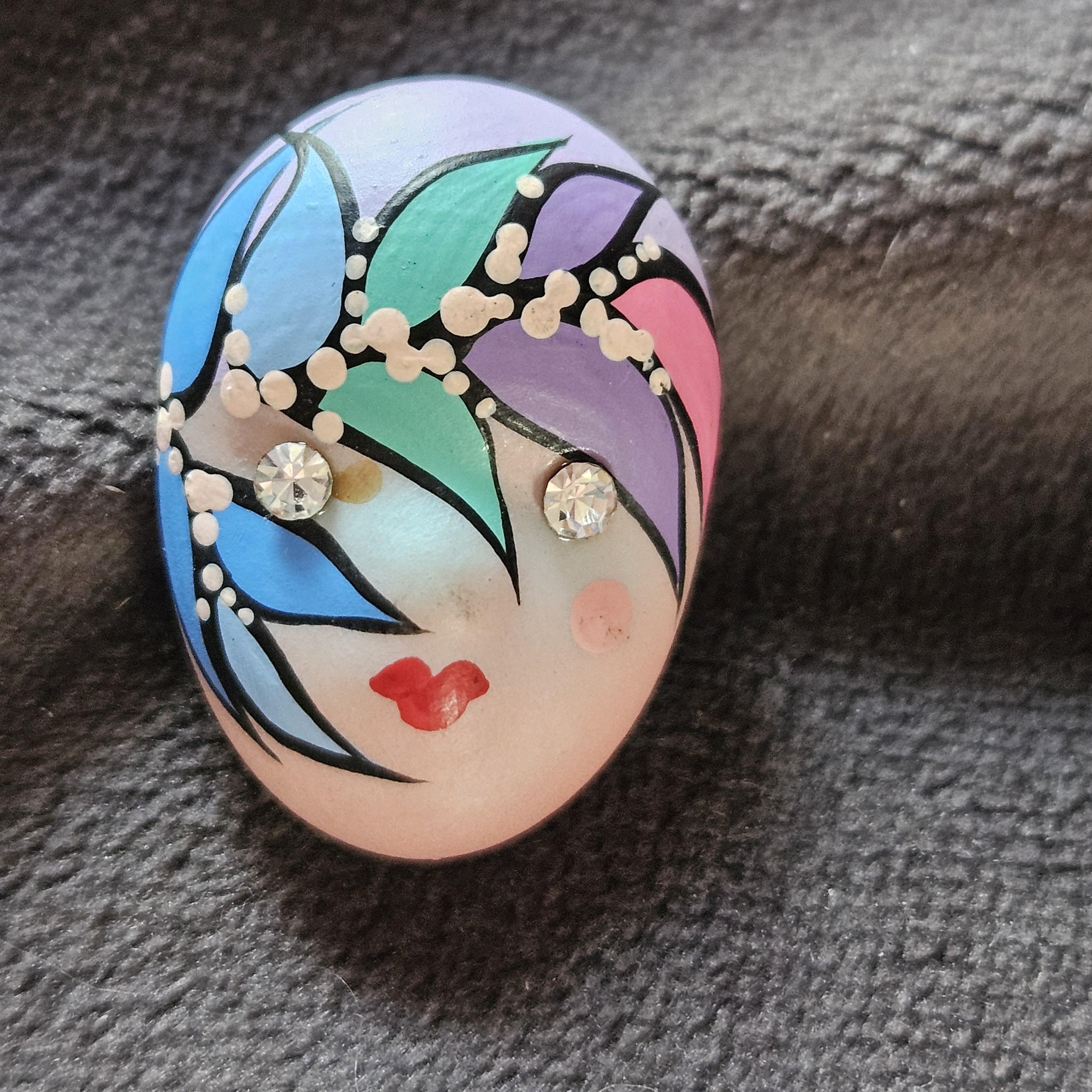 Step into mystery and magick with this Enchanted Vintage Face Pin, a one-inch treasure reminiscent of a Mardi Gras masquerade mask, alive with enchantment and energetic presence. With shimmering rhinestone eyes and a feather-like design in blues, greens, purples, and pinks, this pin is both a striking accessory and a powerful spiritual amulet.