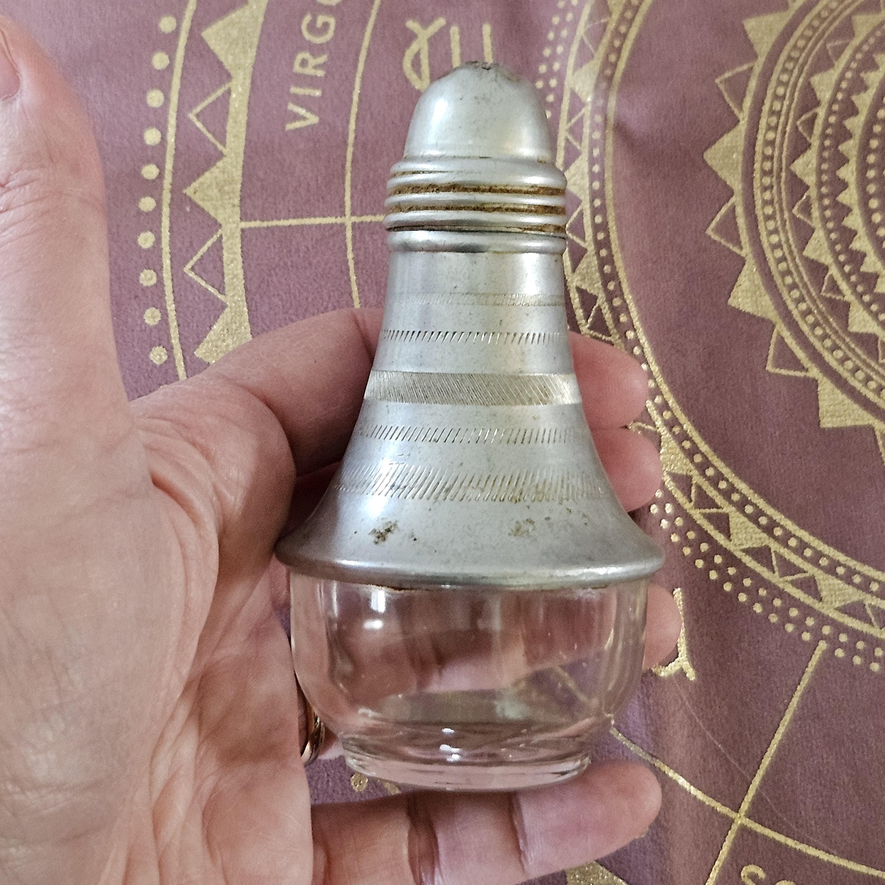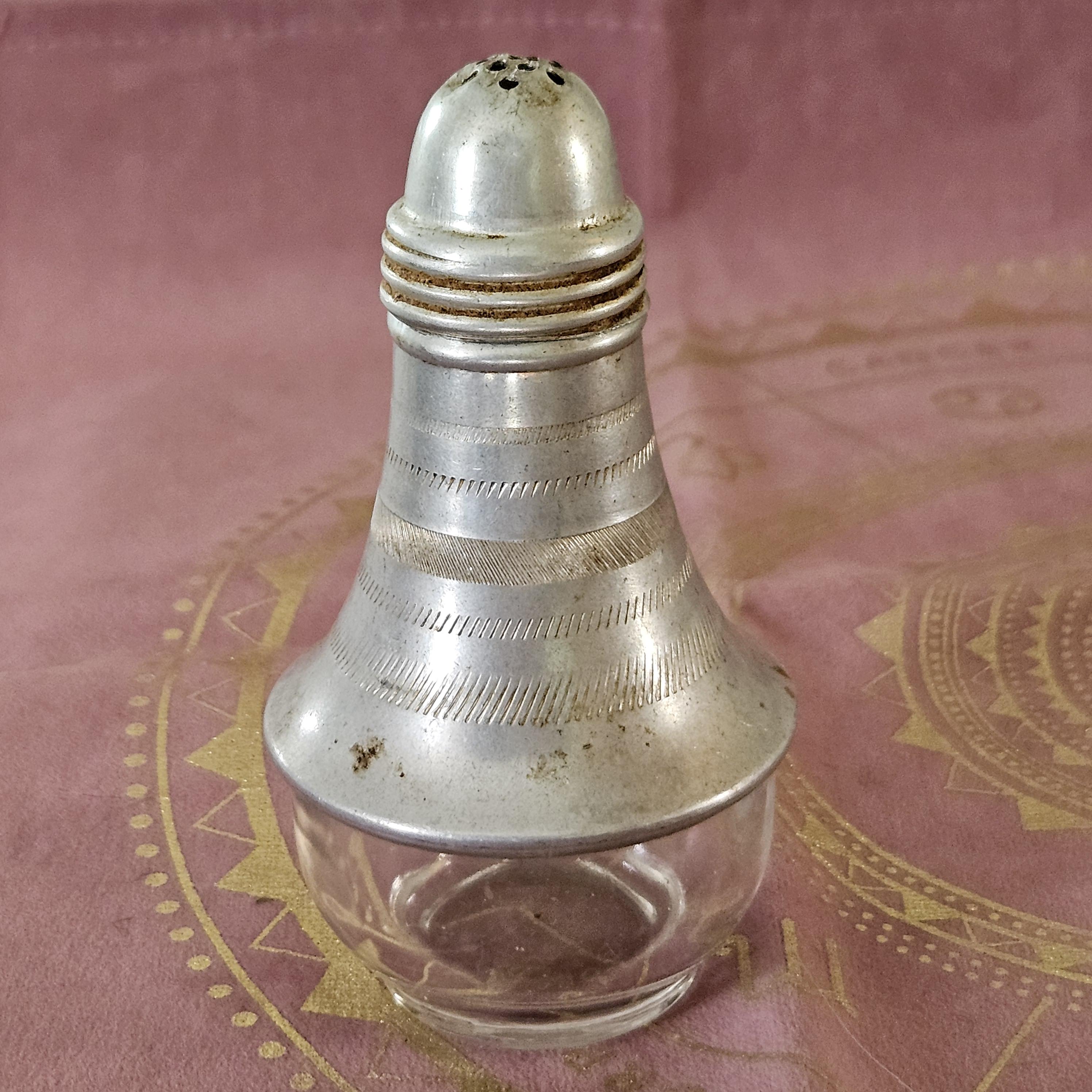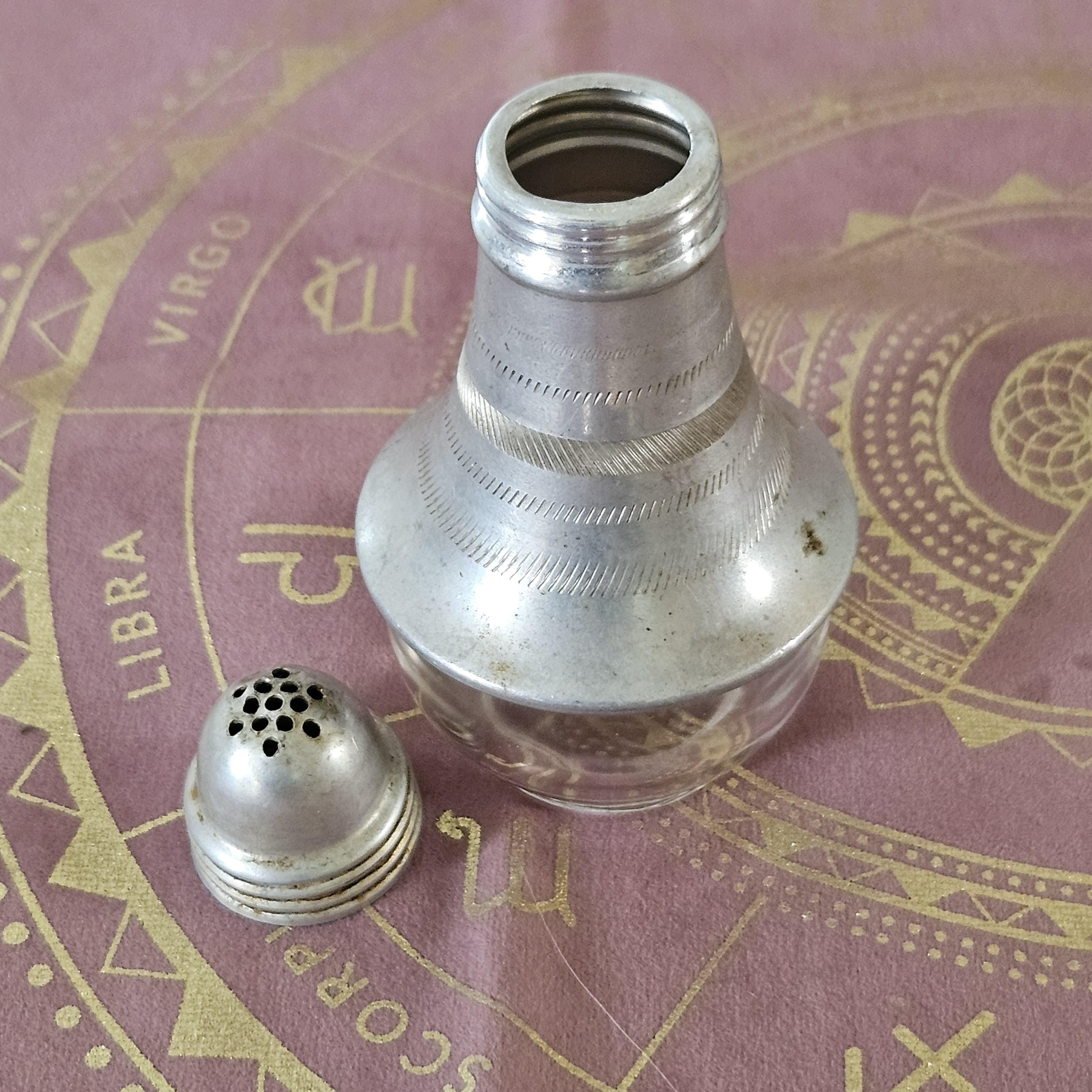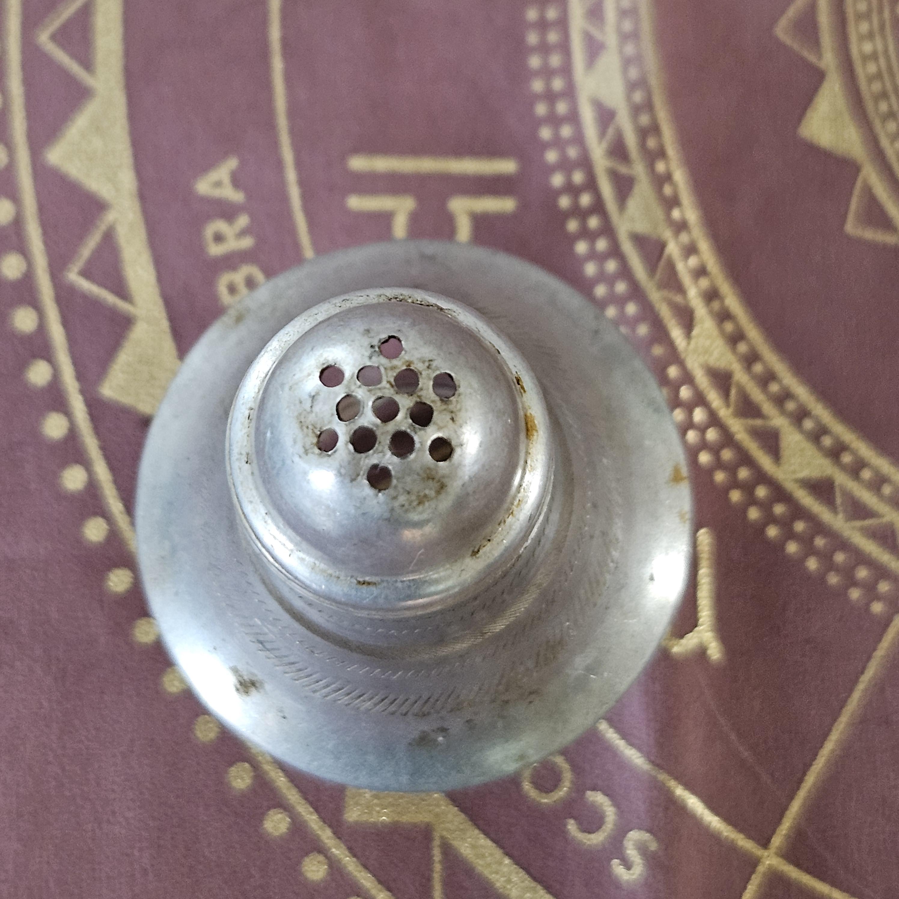 This charming vintage salt shaker from the 1940s carries both nostalgic charm and spiritual potential. Made with an etched aluminum top and a clear glass bottom, it's a unique find that blends form with function—perfect for the modern witch or spiritual practitioner seeking tools with character.