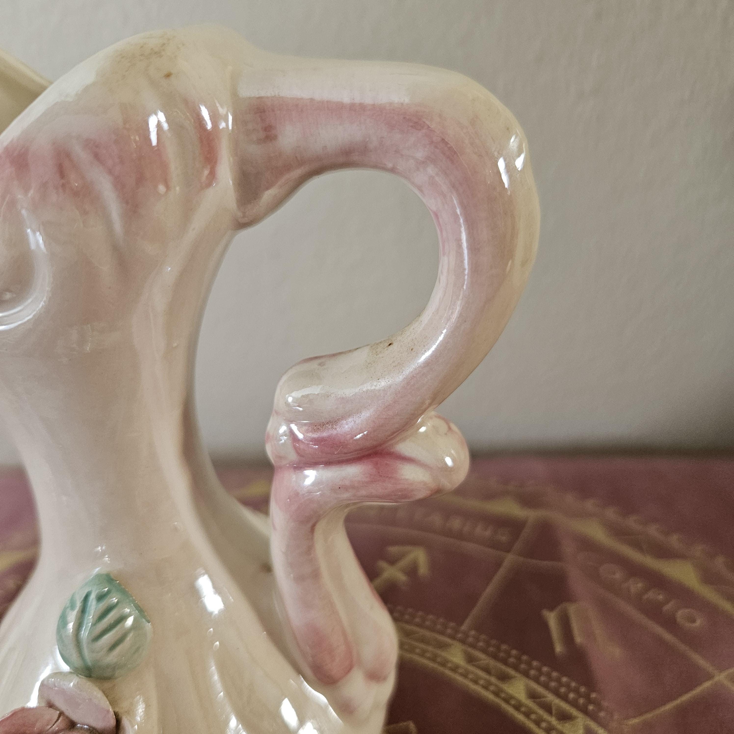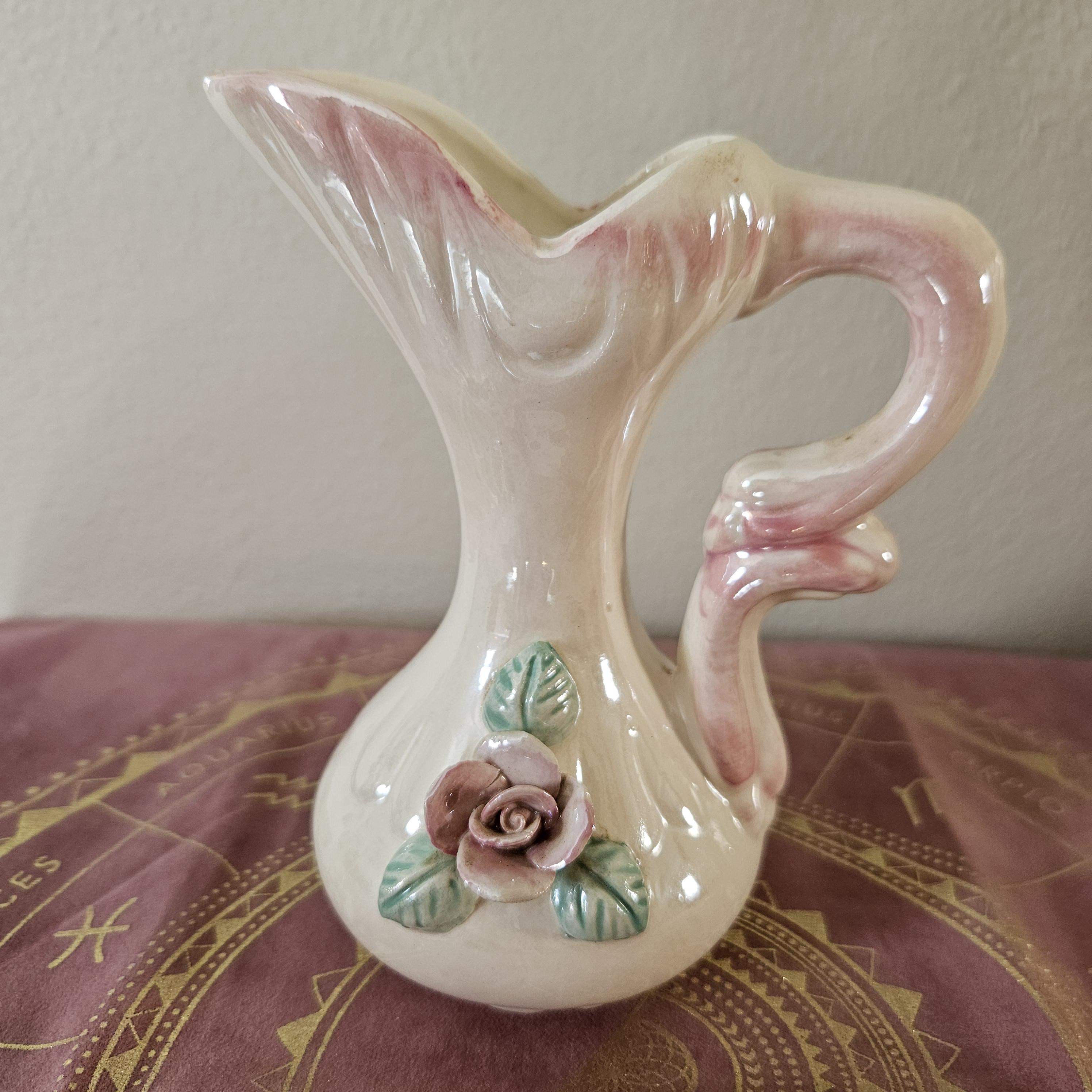 This softly colored vintage ceramic pitcher brings delicate beauty and quiet strength to your sacred space. With its curved handle, soft pink and ivory glaze, and sculpted blush rose with sage-toned leaves, it radiates grace, love, and divine feminine energy.