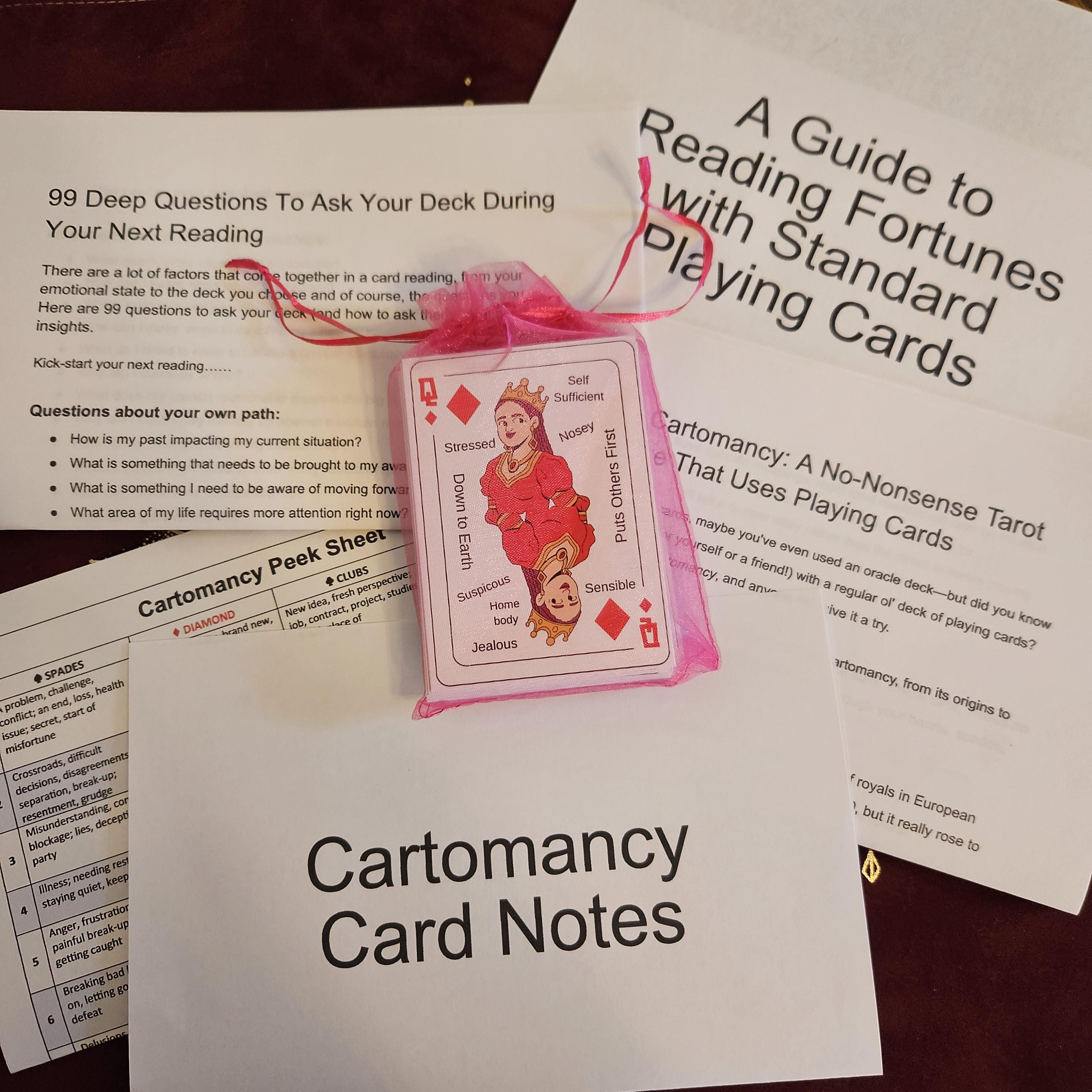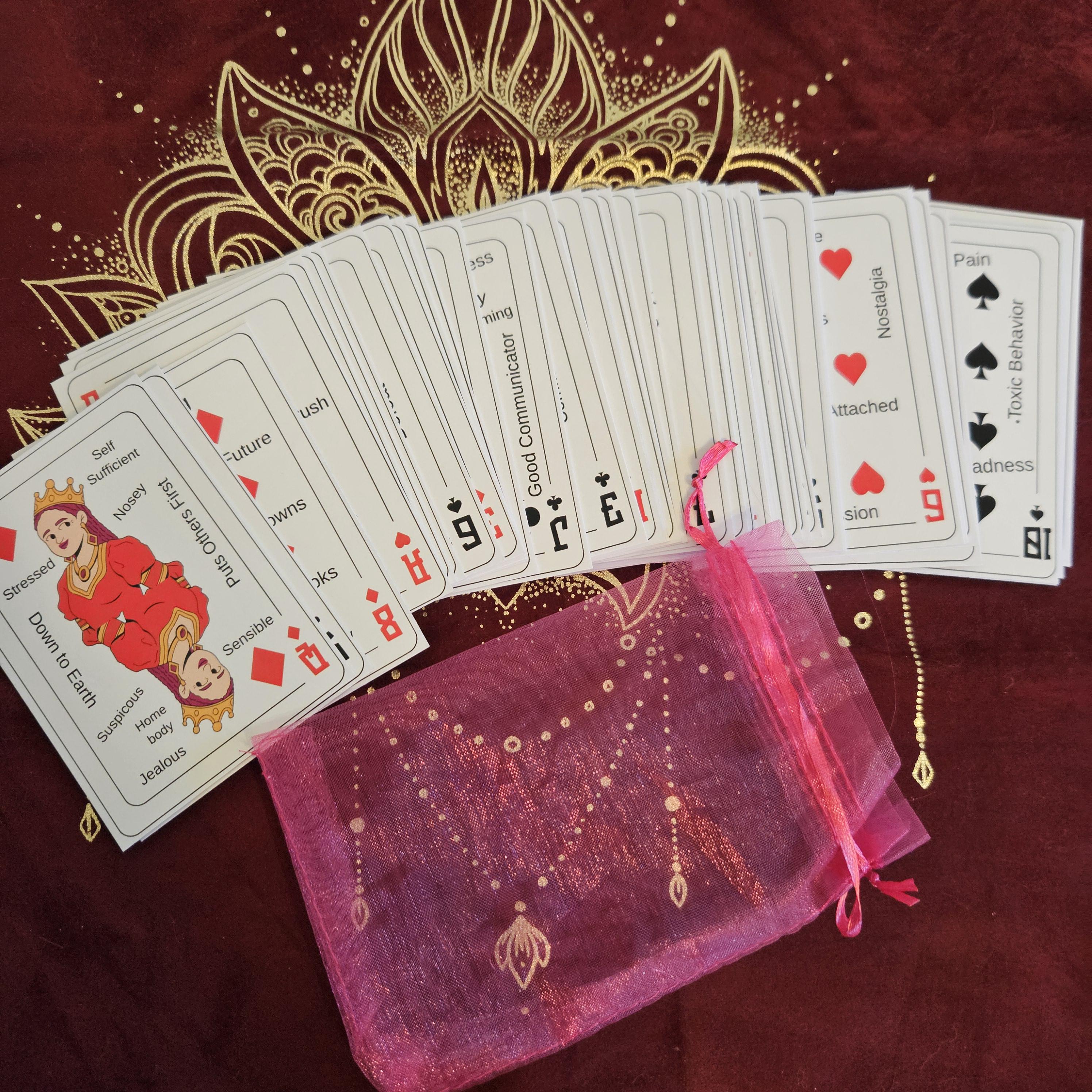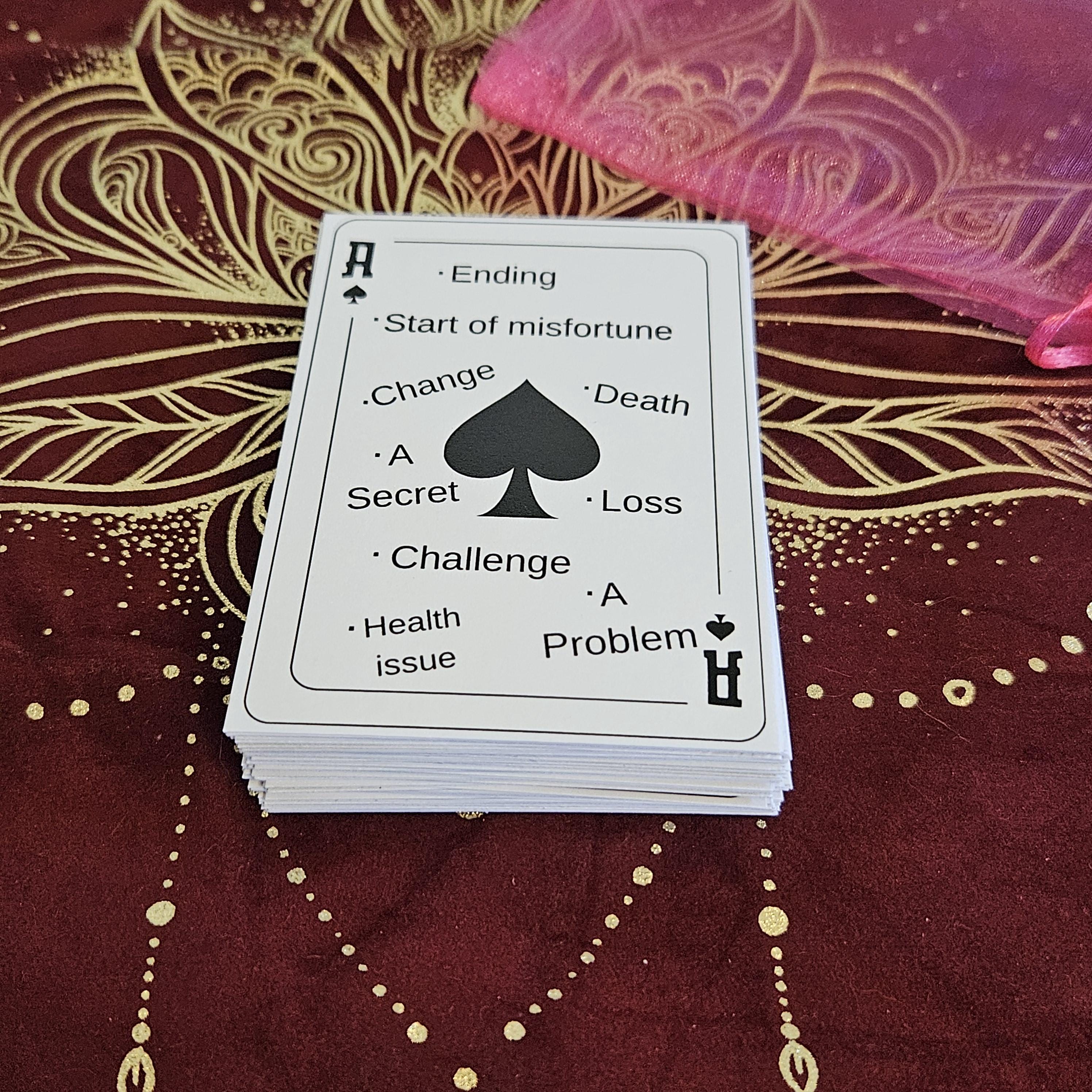 This cartomancy learner deck is designed to help beginners explore intuitive reading using standard playing cards. Each card is clearly labeled with traditional cartomantic meanings, allowing you to focus on developing familiarity and intuition without constantly referencing a guide.