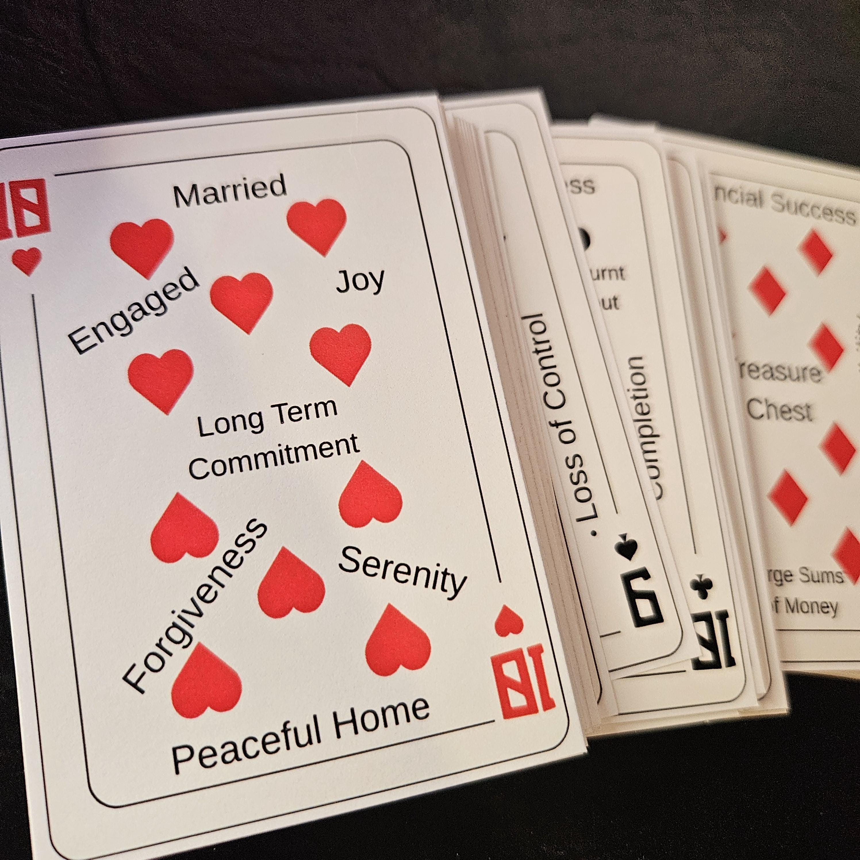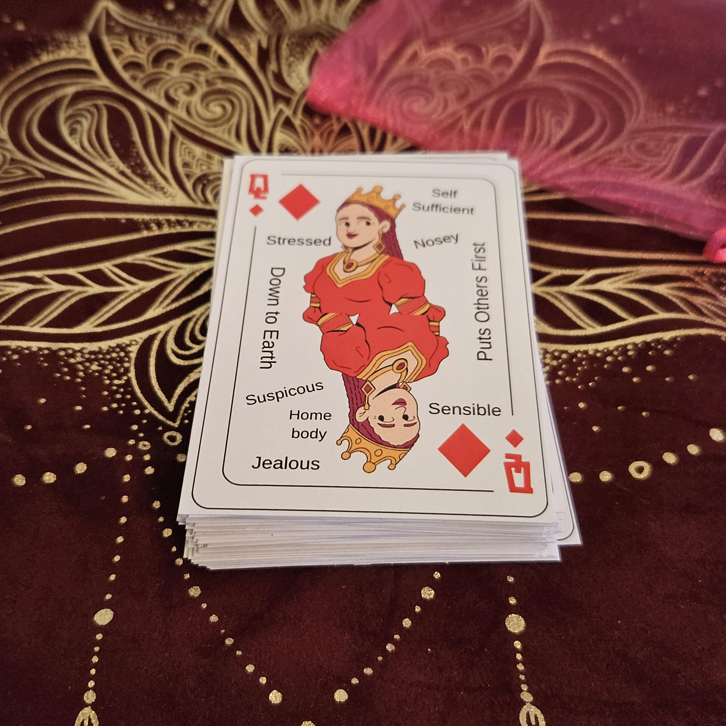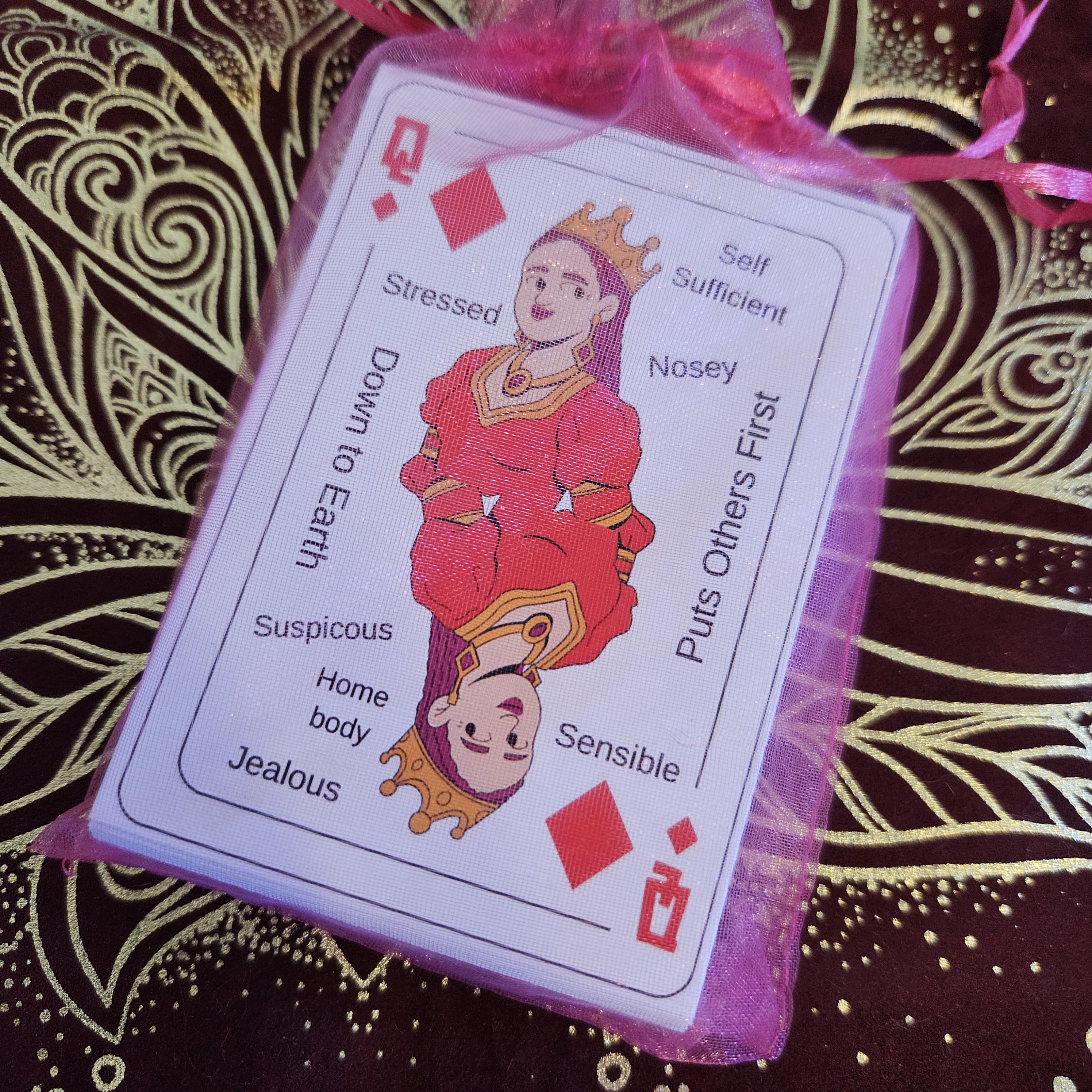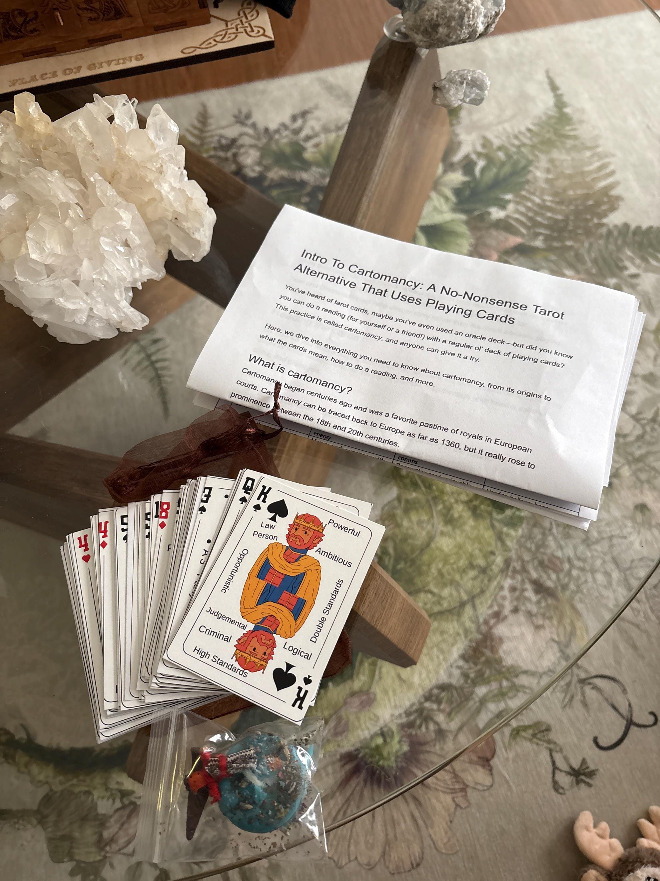 This cartomancy learner deck is designed to help beginners explore intuitive reading using standard playing cards. Each card is clearly labeled with traditional cartomantic meanings, allowing you to focus on developing familiarity and intuition without constantly referencing a guide.