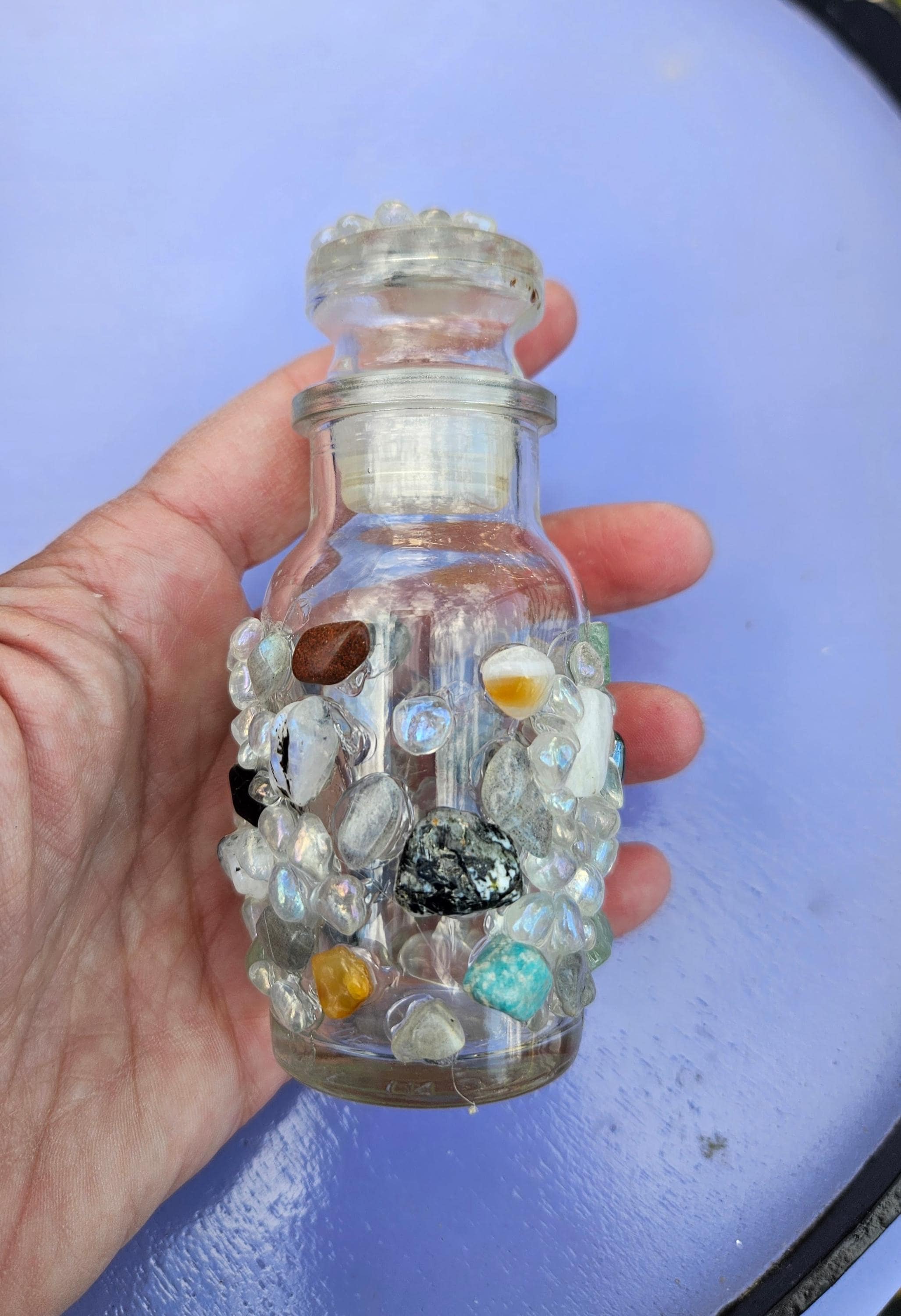 A stunning glass jar featuring adornment of crystals placed by hand in a random pattern including moonstone, onyx, aventurine, rose quartz, and aura quartz along with others. A snug stopper with a central moonstone caps this bottle.