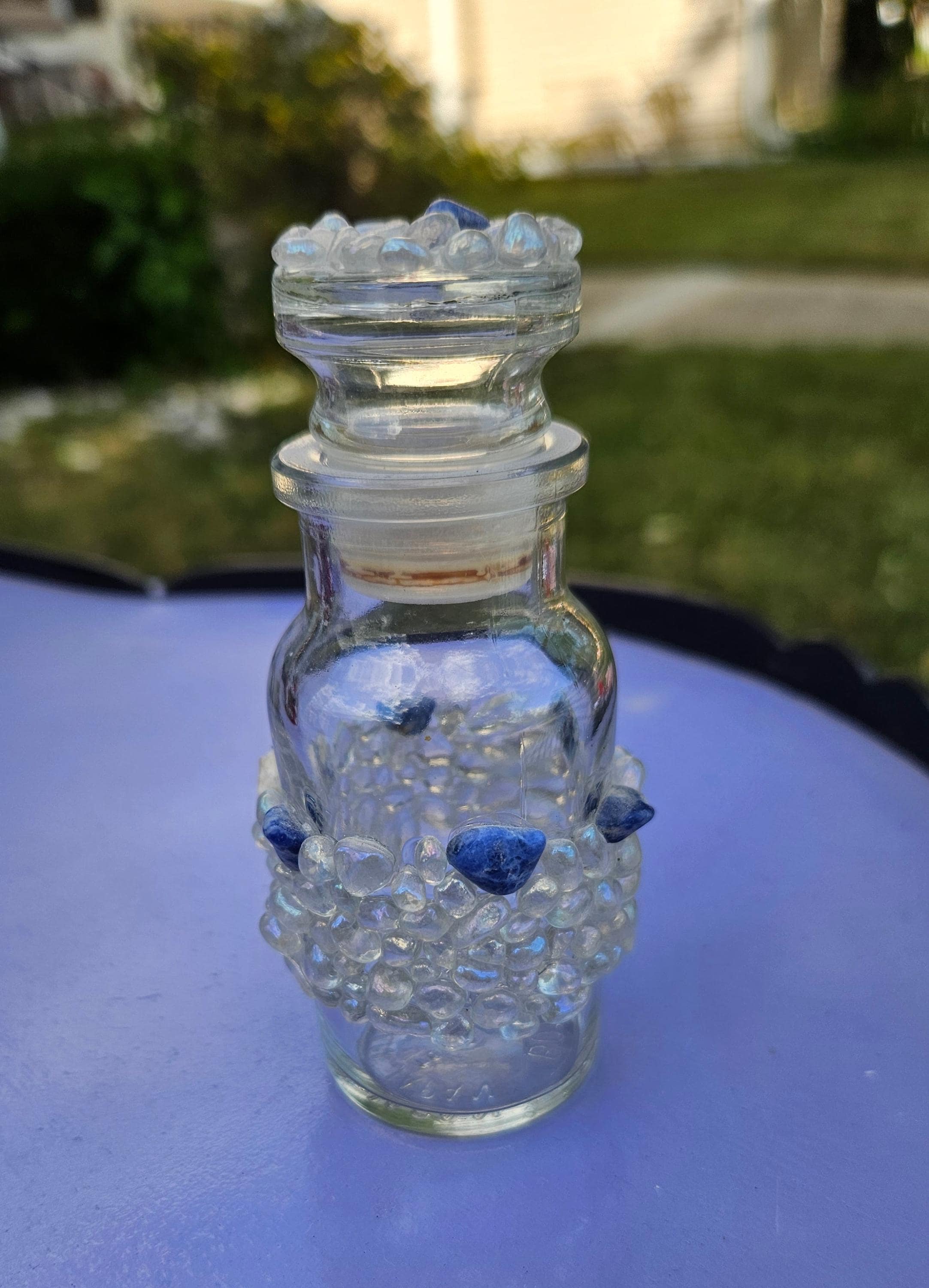 A stunning glass jar featuring adornment of crystals placed by hand including soldalite and aura quart . A snug stopper with a central soldalite caps this bottle.