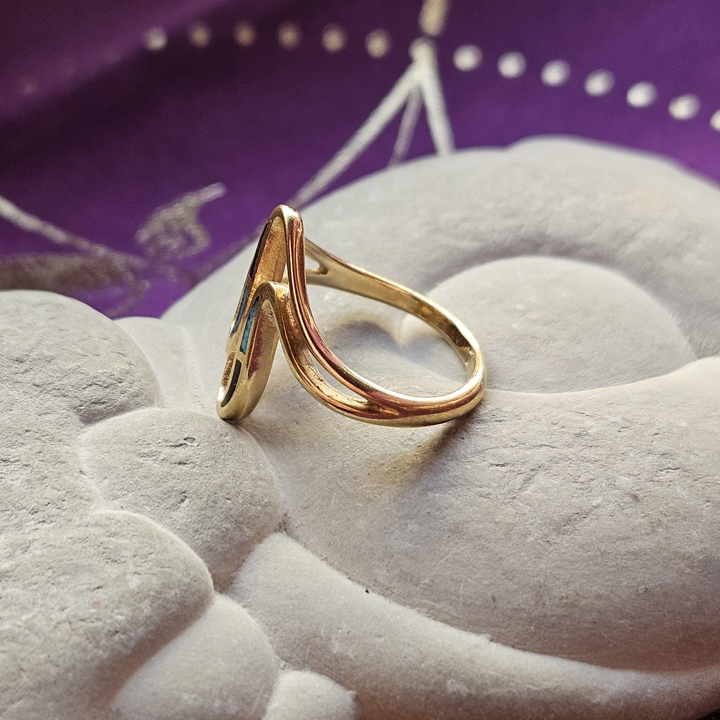 This vintage gold electroplated ring, featuring a wonderful swirl design with turquoise inlay dates to the 1980s and comes to you from a working magickal collection.