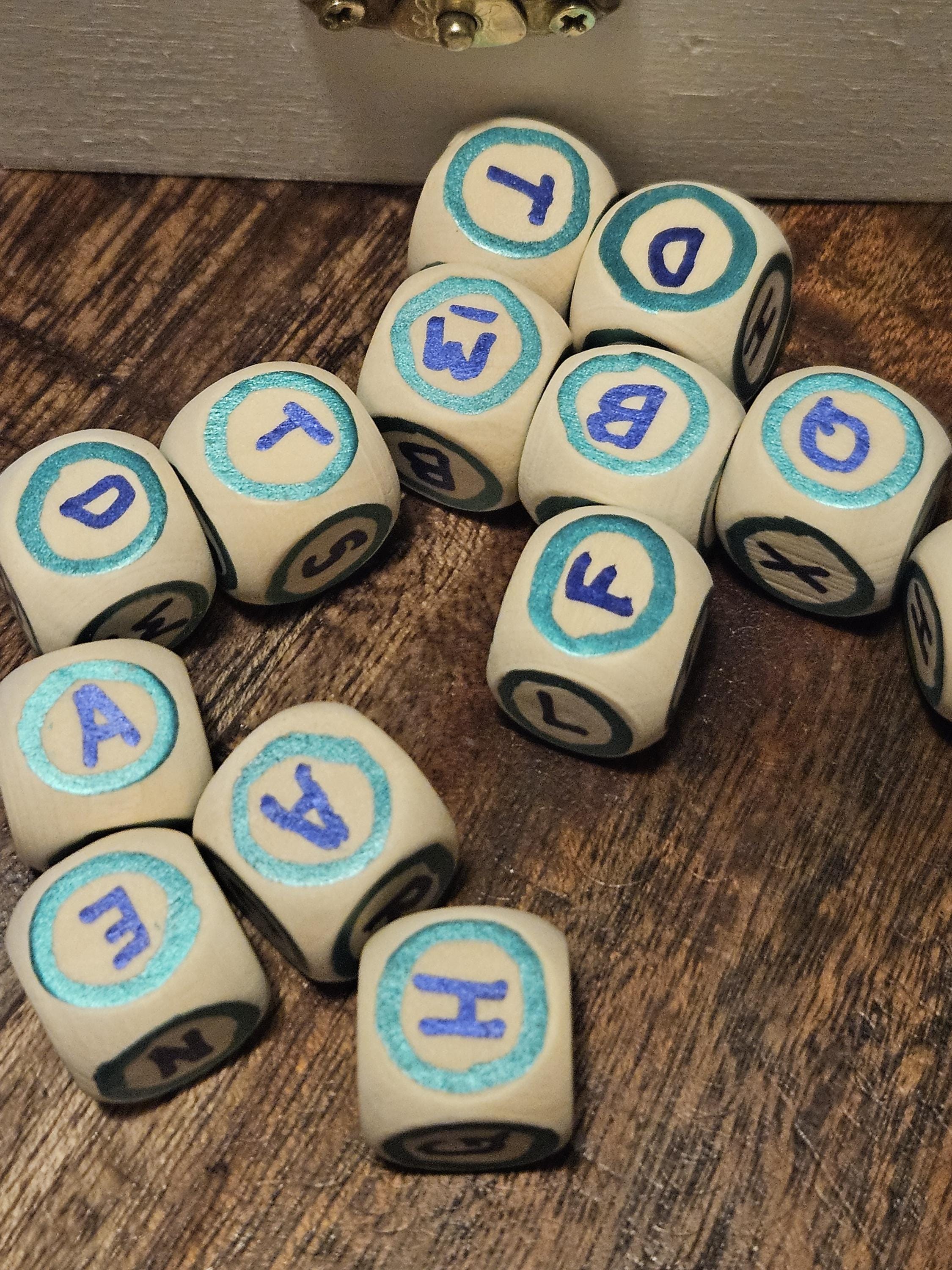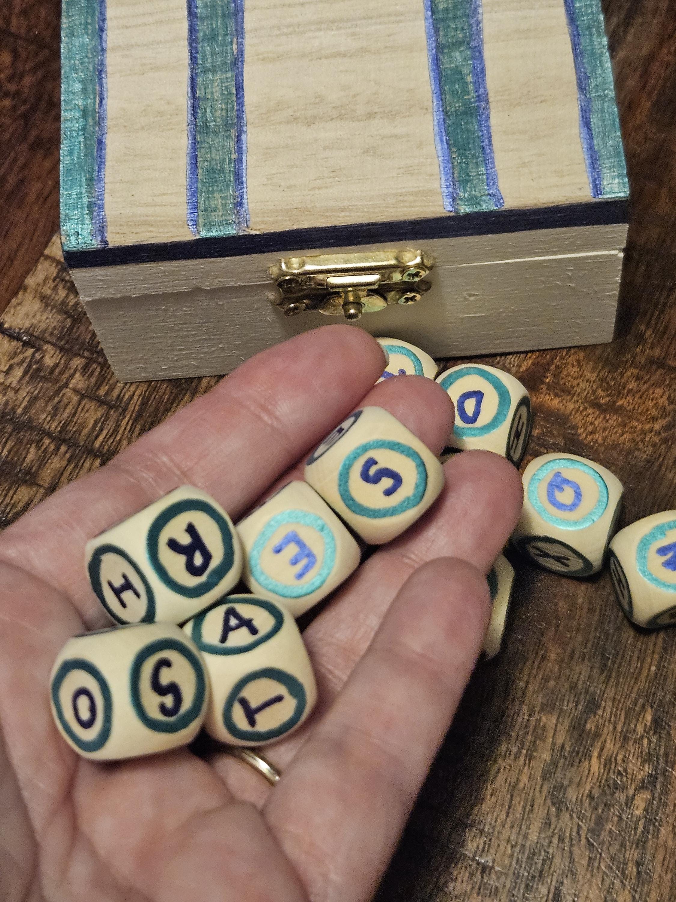 Each set includes 13 hand-painted wooden dice, created with a family held recipe paint and ink blend steeped in mugwort and spirit-aligned herbs and crystals, then ritually blessed through sacred lineage practices to invite intuitive connection and insight.