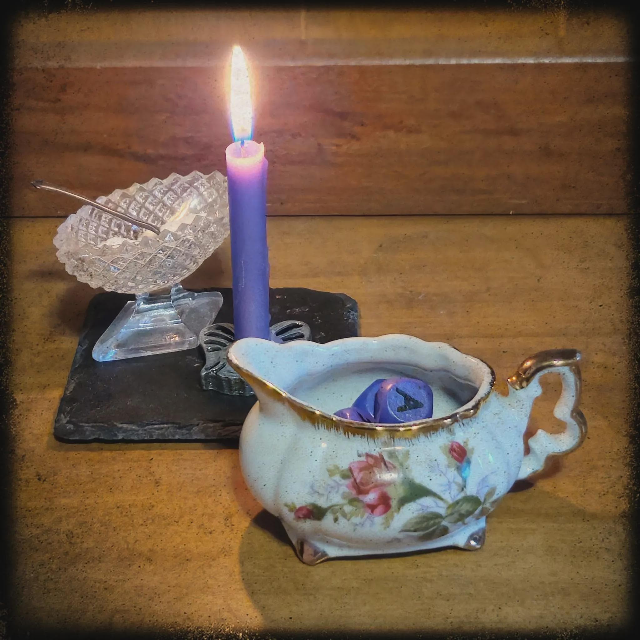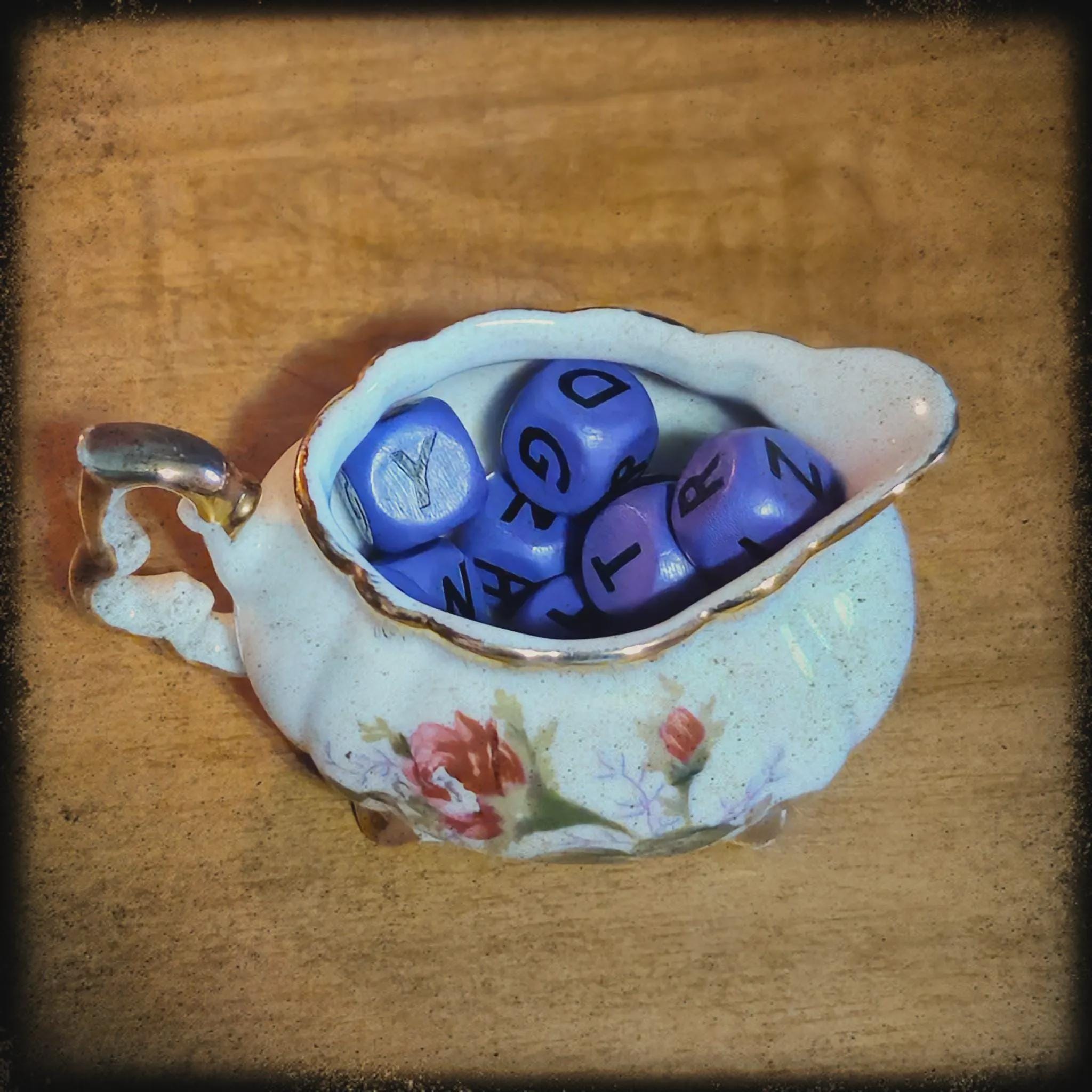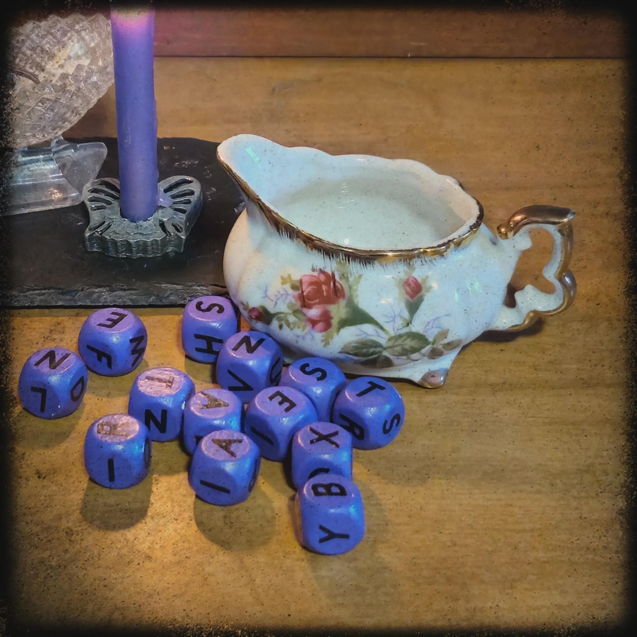These wooden spirit dice are hand painted purple with letters applied and sealed or longevity and presented in a wonderful and beautiful vintage creamer cup. This cup can be used for decorative storage as well as to "throw" the dice during sessions.