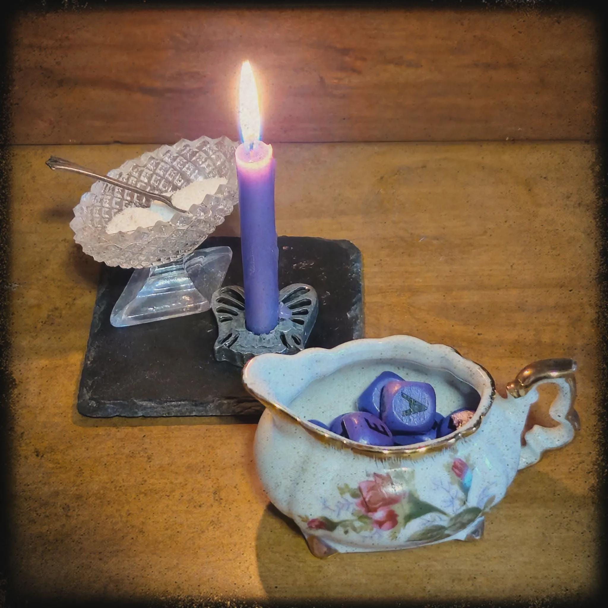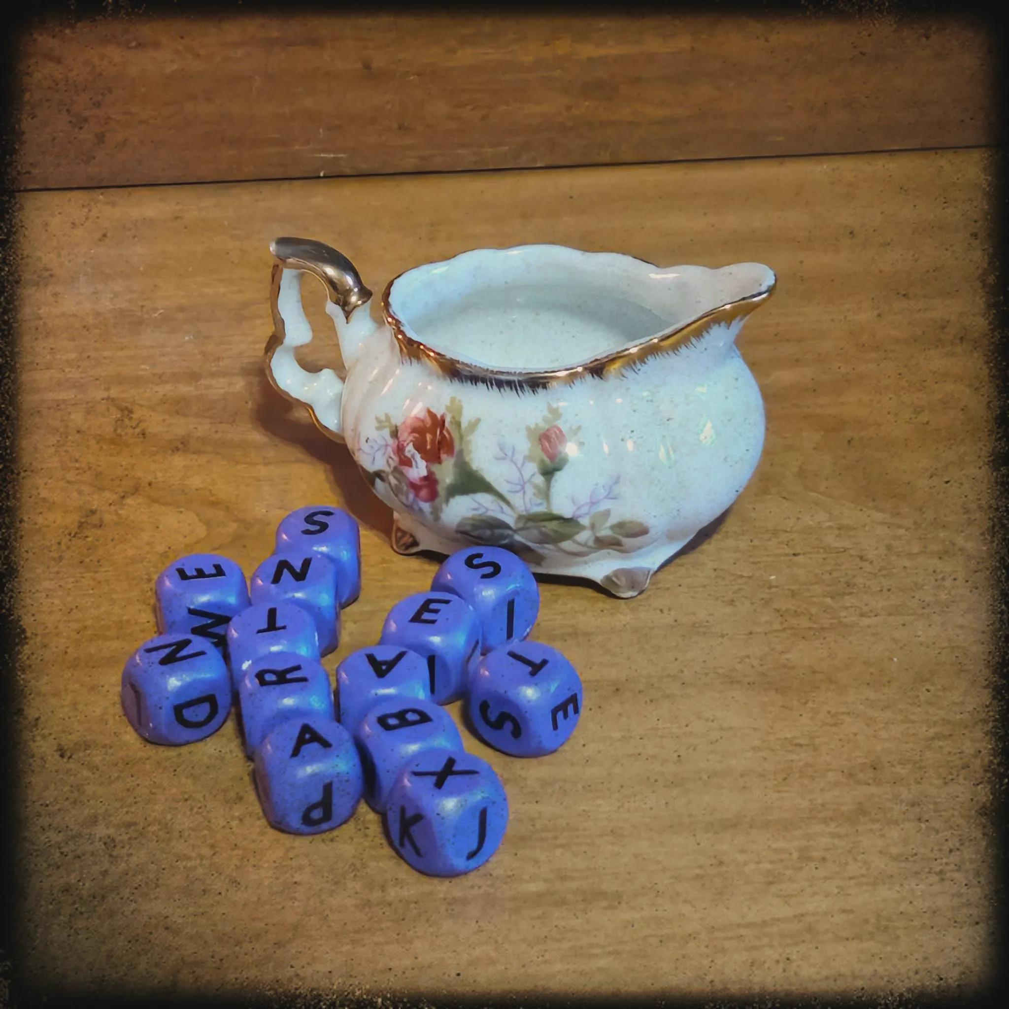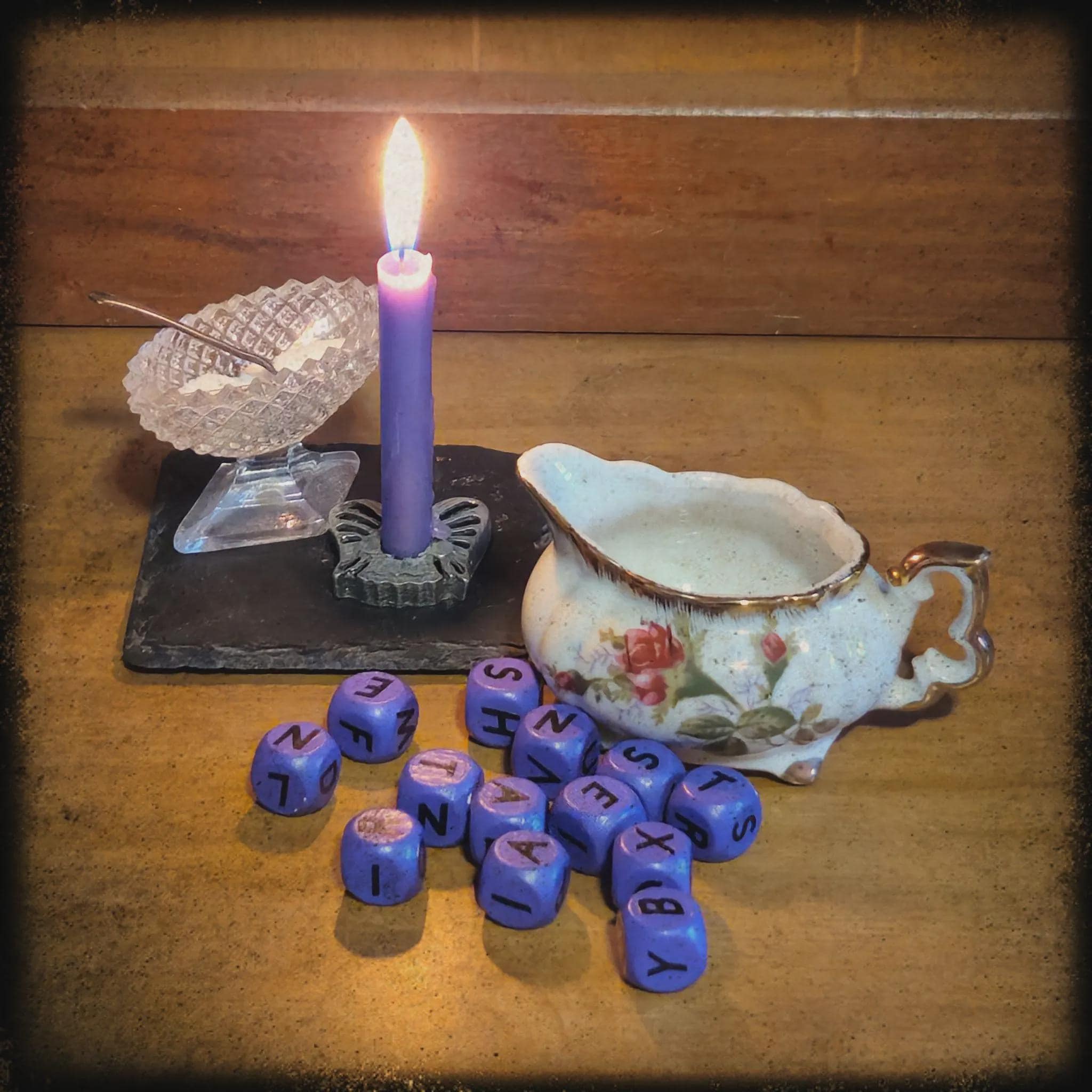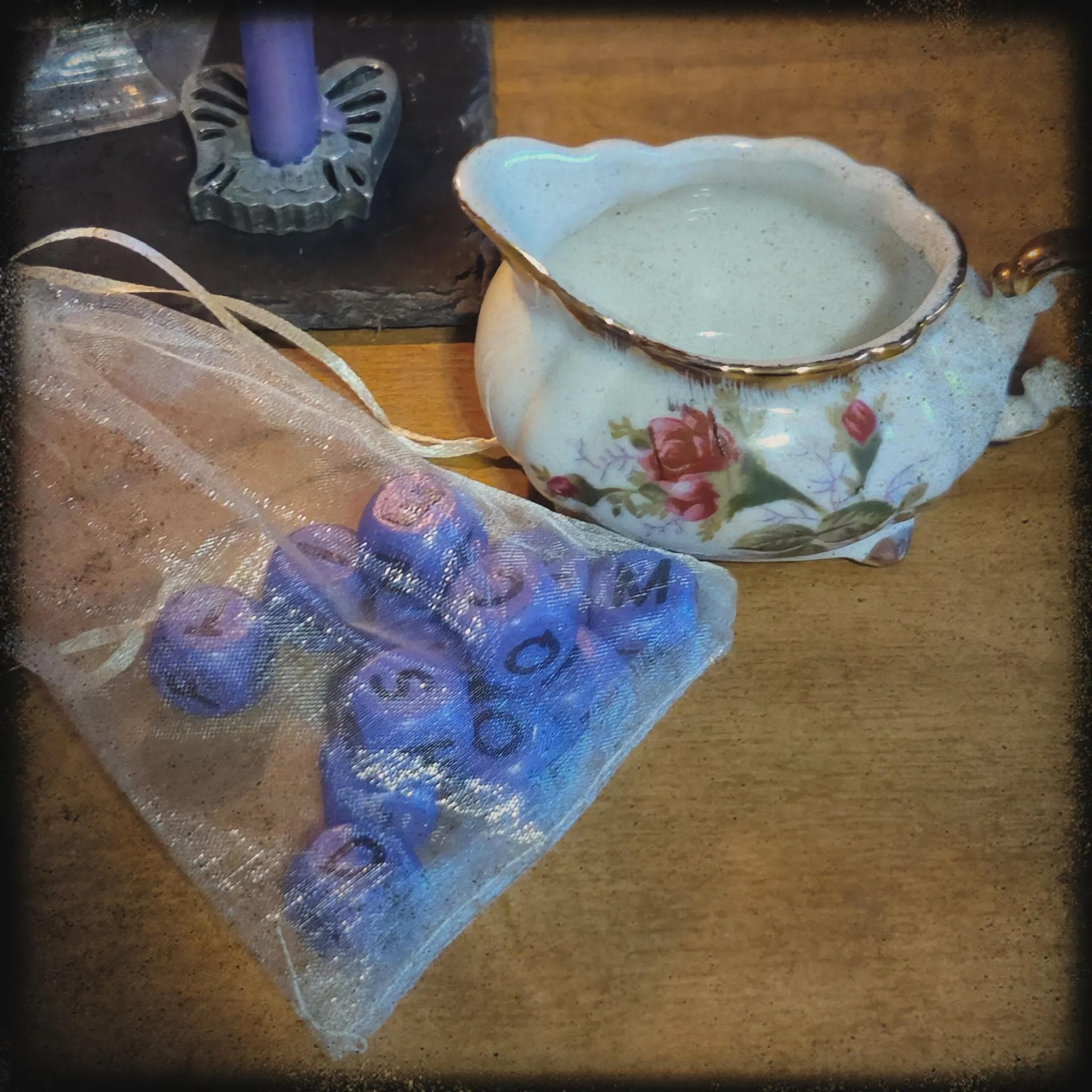 These wooden spirit dice are hand painted purple with letters applied and sealed or longevity and presented in a wonderful and beautiful vintage creamer cup. This cup can be used for decorative storage as well as to "throw" the dice during sessions.